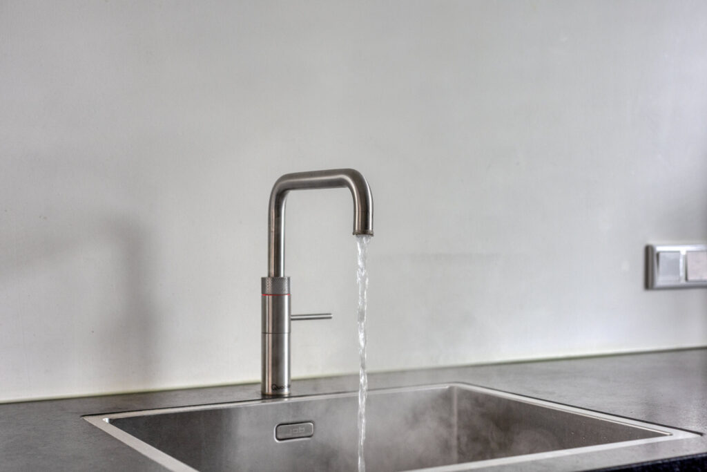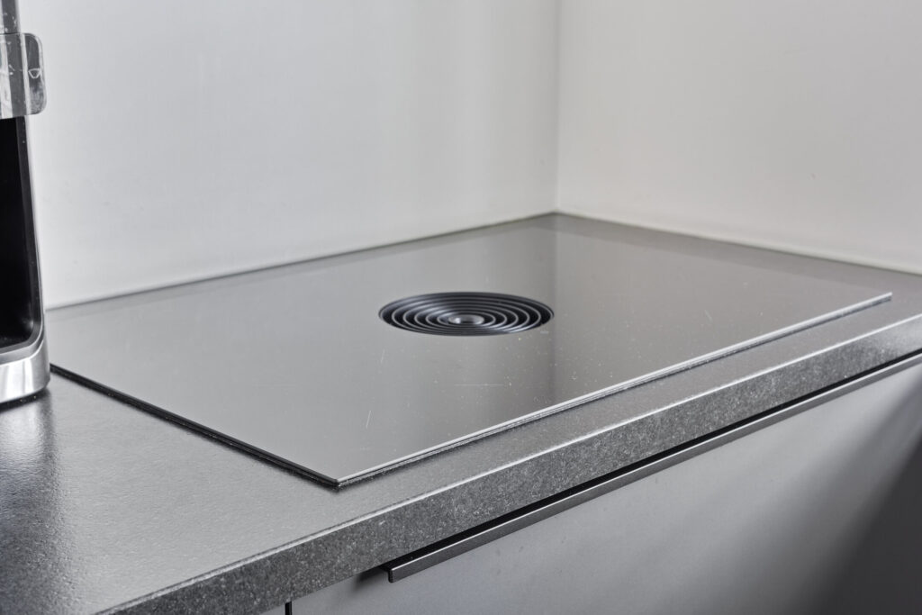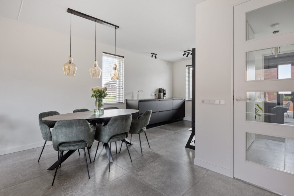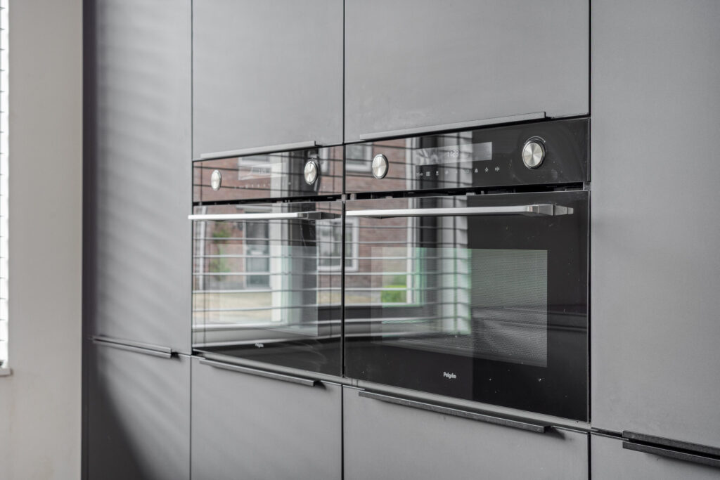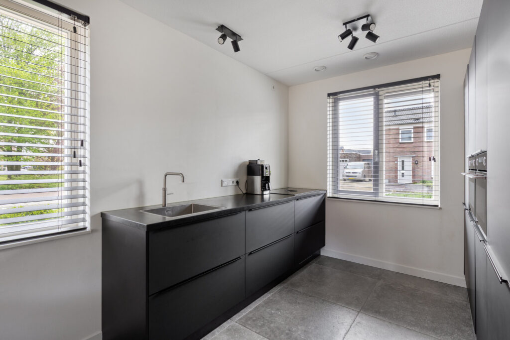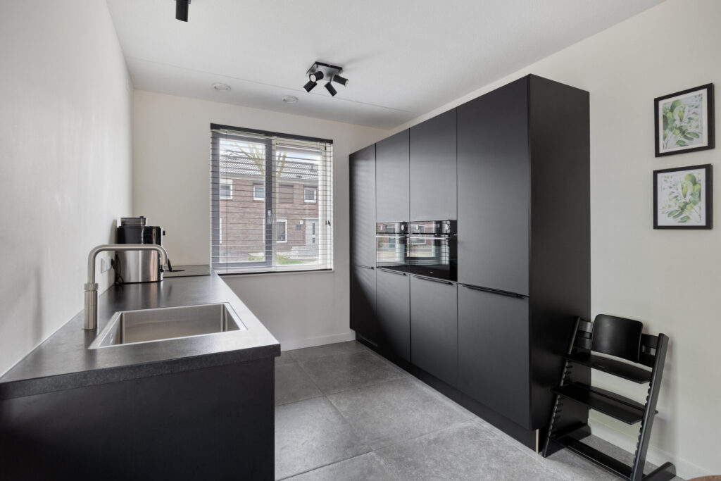 Aan de voorzijde ligt de moderne open keuken in een strakke, zwarte uitvoering. De keuken is opgesteld in twee tegenover elkaar geplaatste wandopstellingen en voorzien van diverse inbouwapparatuur, waaronder een inductiekookplaat met geïntegreerde afzuiging (BORA), vaatwasser, koelkast, vriezer, Quooker en twee combi oven-/magnetrons. Ook hier is vloerverwarming aanwezig.