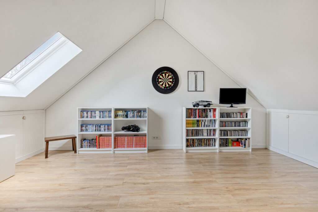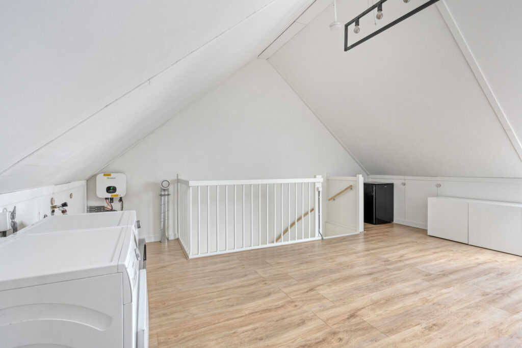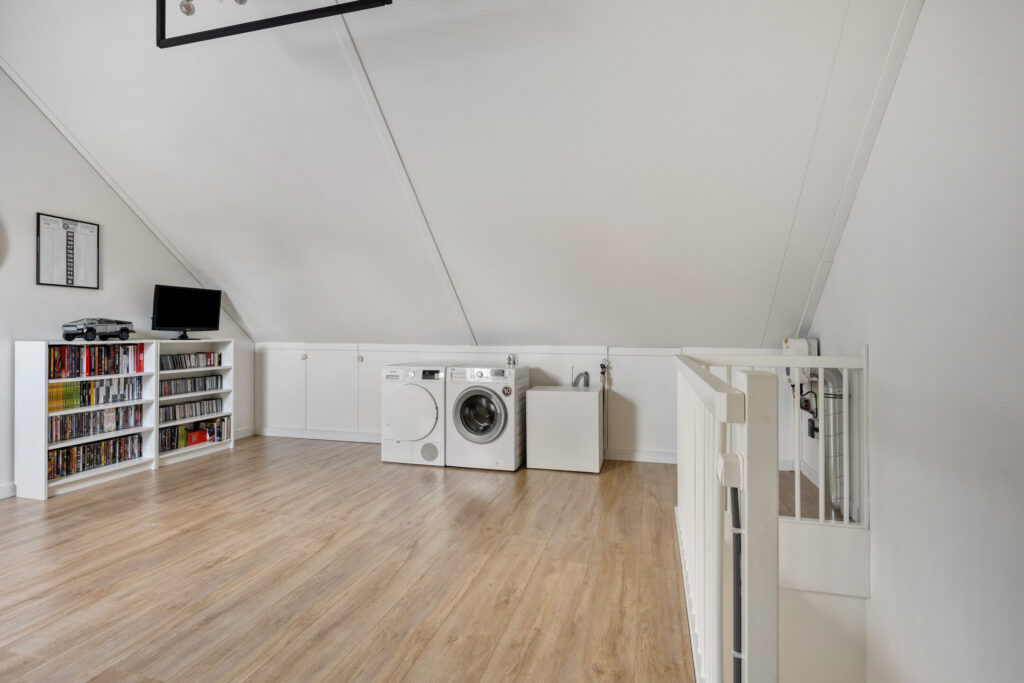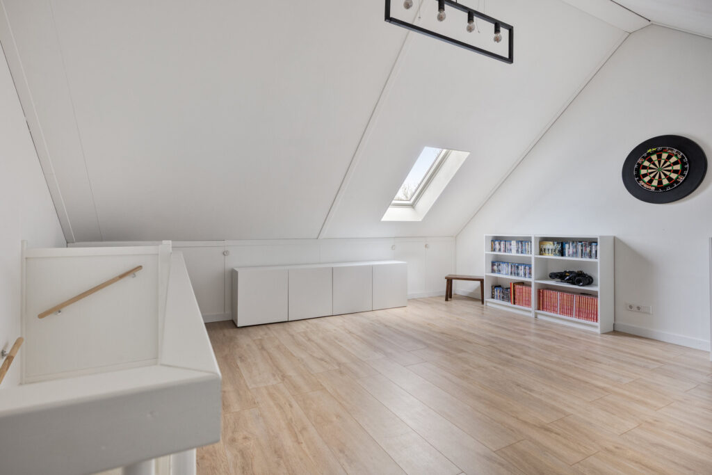 Via een vaste trap bereik je de ruime zolderverdieping. Deze open ruimte biedt volop mogelijkheden en kan eenvoudig worden ingericht als extra slaapkamer of werkruimte. Hier bevinden zich tevens de aansluitingen voor wasapparatuur en de omvormer van de zonnepanelen. Extra bergruimte is aanwezig onder de knieschotten.