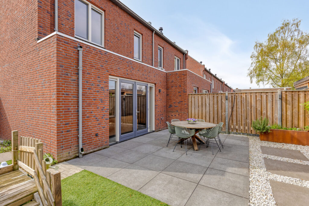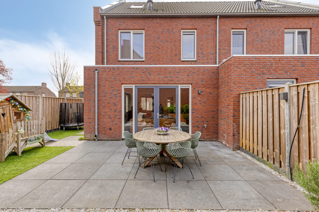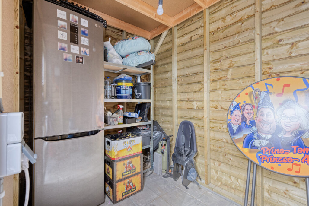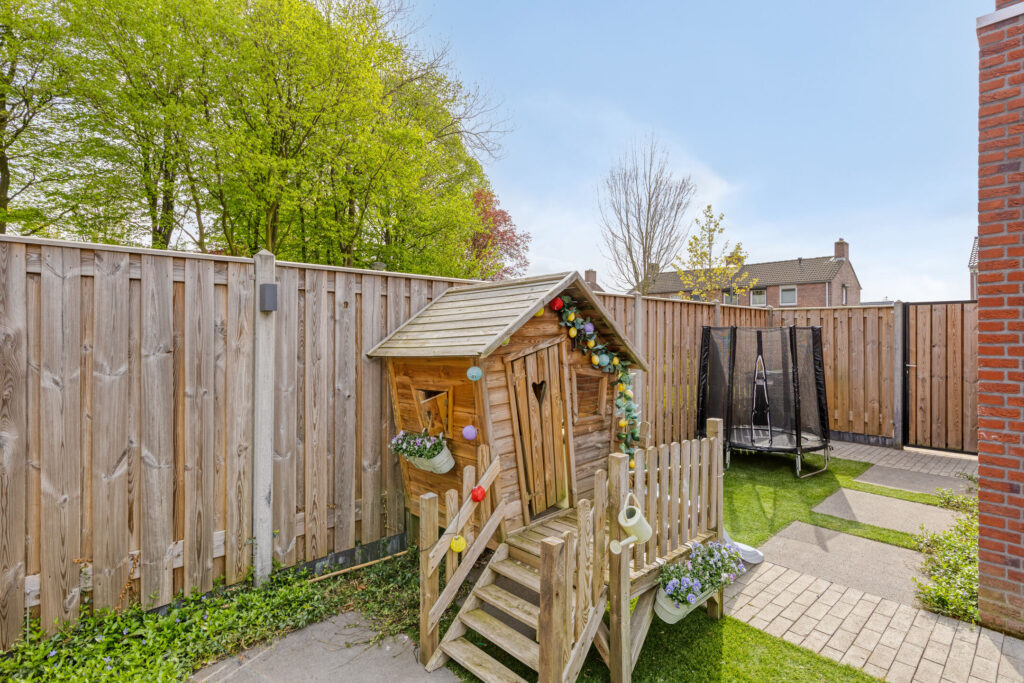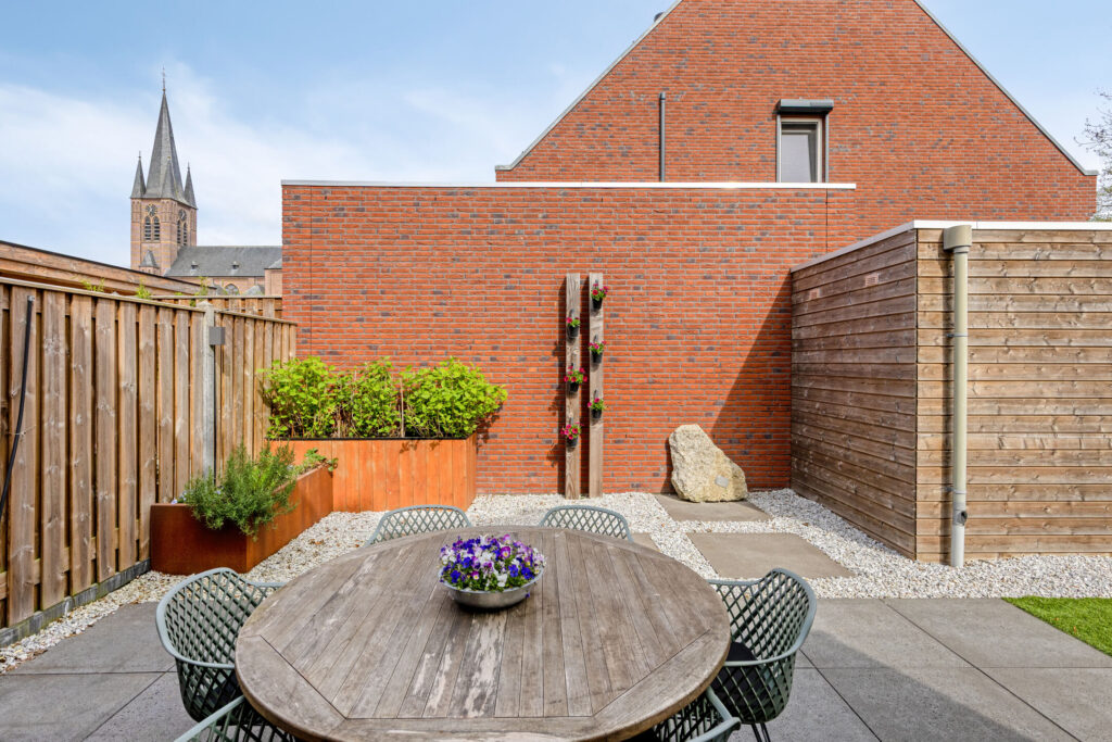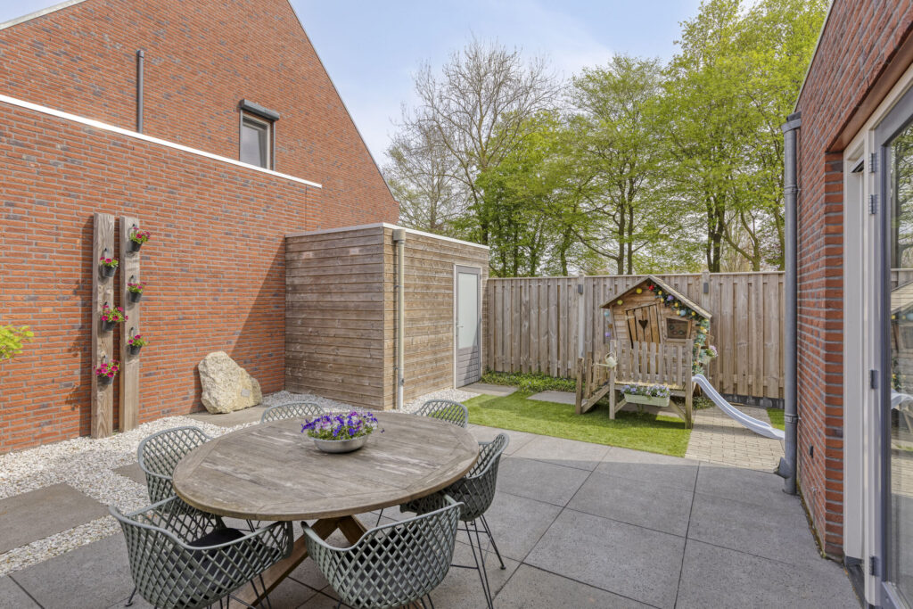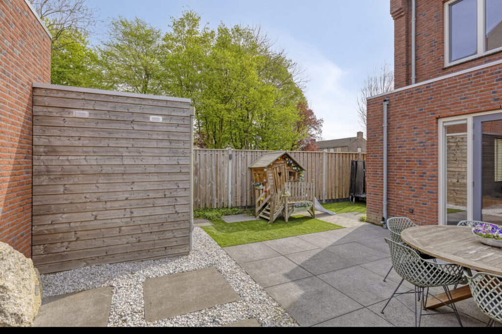 De achtertuin is grotendeels verhard en daardoor onderhoudsarm. Je geniet hier van een mooi uitzicht op de Zeilbergse kerk. De tuin is voorzien van water- en stroomaansluitingen en beschikt over een houten berging met elektra.