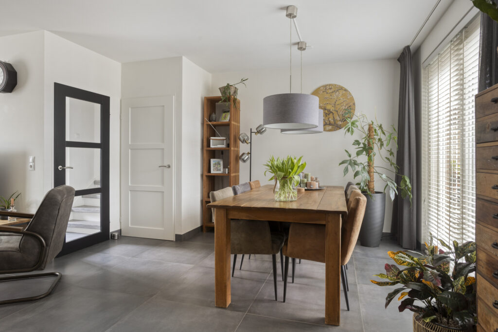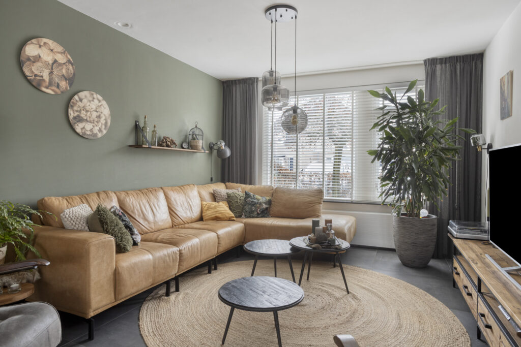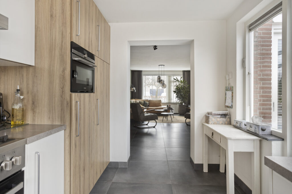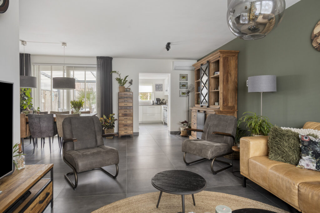 De woonkamer is ruim van opzet en prettig licht door de grote raampartijen aan de voor en achterzijde. De vloer is volledig betegeld en voorzien van vloerverwarming. Wanden en plafonds zijn strak gestuct. Aan de achterzijde is de woning uitgebouwd, waardoor extra leefruimte is ontstaan. Via de schuifpui heb je direct toegang tot de tuin. In de woonkamer is airconditioning aanwezig voor zowel koelen als verwarmen.