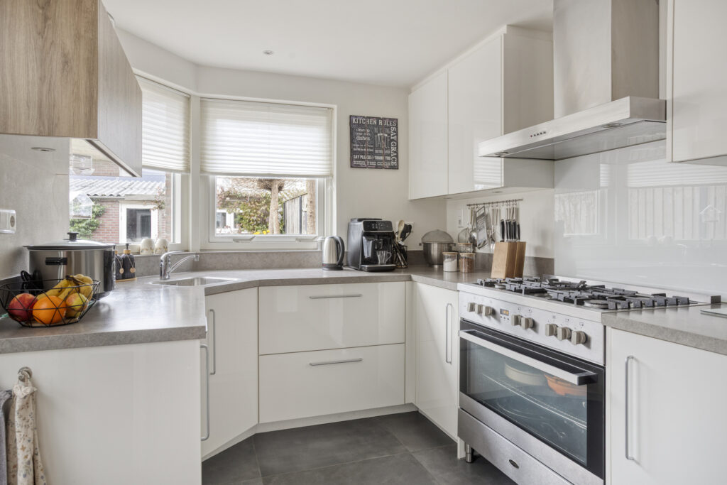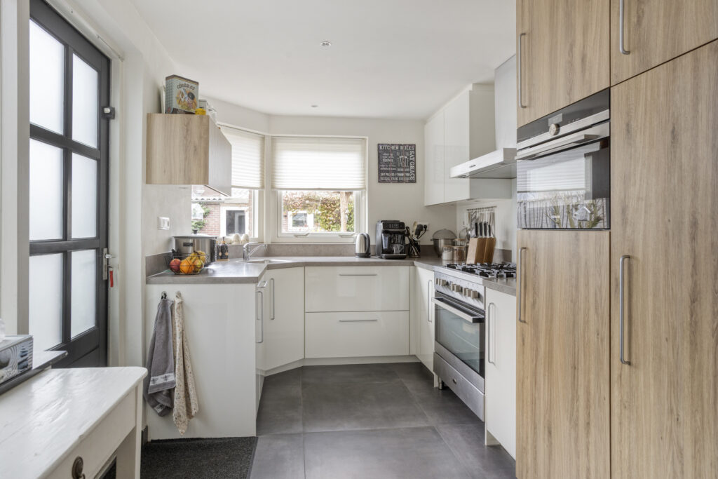 De keuken bevindt zich aan de achterzijde van de woning en is uitgevoerd in een U opstelling. De keuken is compleet uitgerust met een vaatwasser, kraan met close in boiler, 5 pits gasfornuis, grote oven van Belling, RVS afzuigkap, koelkast, separate vriezer en een combi oven. Een praktische keuken met veel werk en bergruimte.