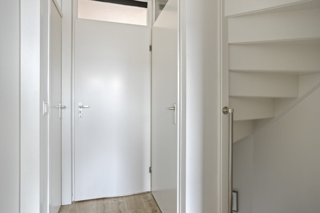 Via de ruime entree kom je binnen in de woning. De hal is voorzien van een tegelvloer en geeft toegang tot de meterkast, het toilet, de woonkamer en de netjes afgewerkte trapopgang naar de eerste verdieping met trapverlichting.