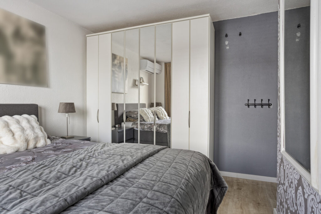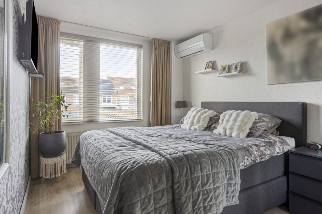 Slaapkamer 2 is eveneens aan de achterzijde gelegen en is de hoofdslaapkamer. Deze kamer is ruim opgezet en biedt voldoende plaats voor een groot bed en een kledingkast. De wanden en het plafond zijn grotendeels gestuct, deels afgewerkt met behang. Daarnaast is deze slaapkamer voorzien van airconditioning voor koelen en verwarmen, wat zorgt voor extra comfort.