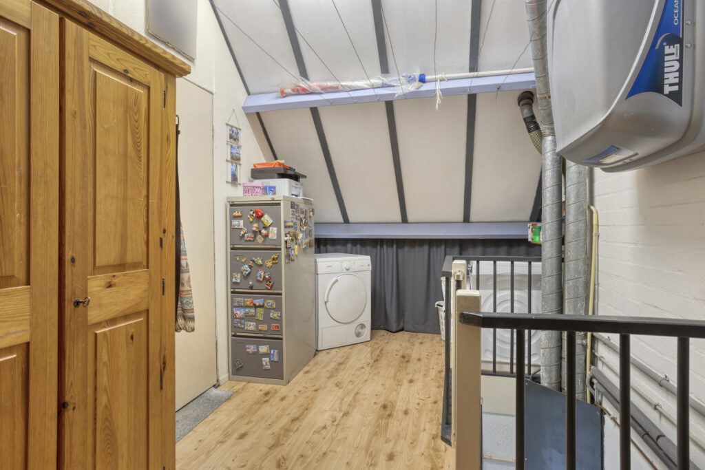 Via een vaste trap bereik je de begaanbare zolderverdieping. Op de voorzolder bevinden zich de aansluitingen voor de wasmachine en droger, de omvormer van de zonnepanelen en de CV ketel van Vaillant uit 2016. De vloer is afgewerkt met een vinyl vloer in houtlook.