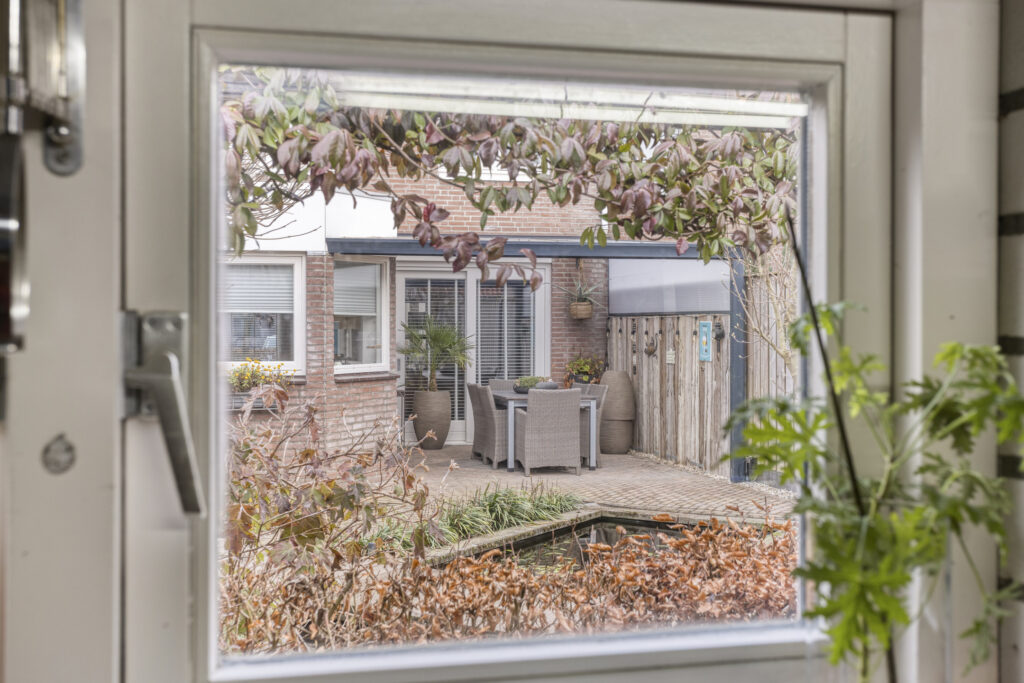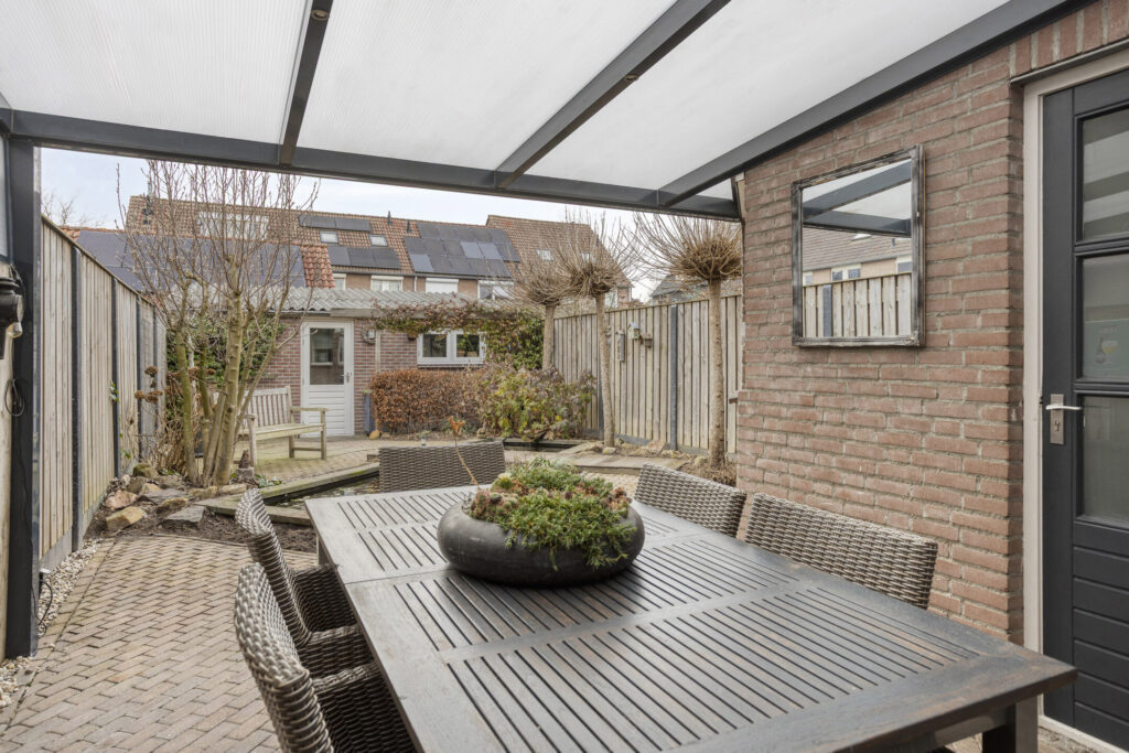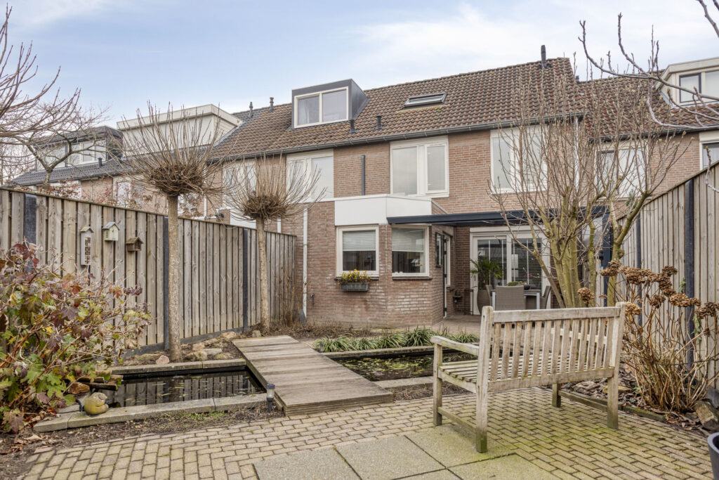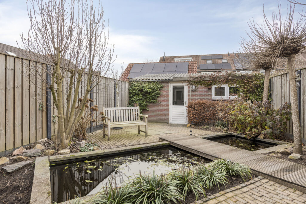 De achtertuin is gelegen op het noordoosten en fraai aangelegd. De tuin beschikt over een terras, een grote vijver met loopbrug en een aluminium overkapping met verlichting. De volwassen beplanting zorgt voor veel groen en privacy.