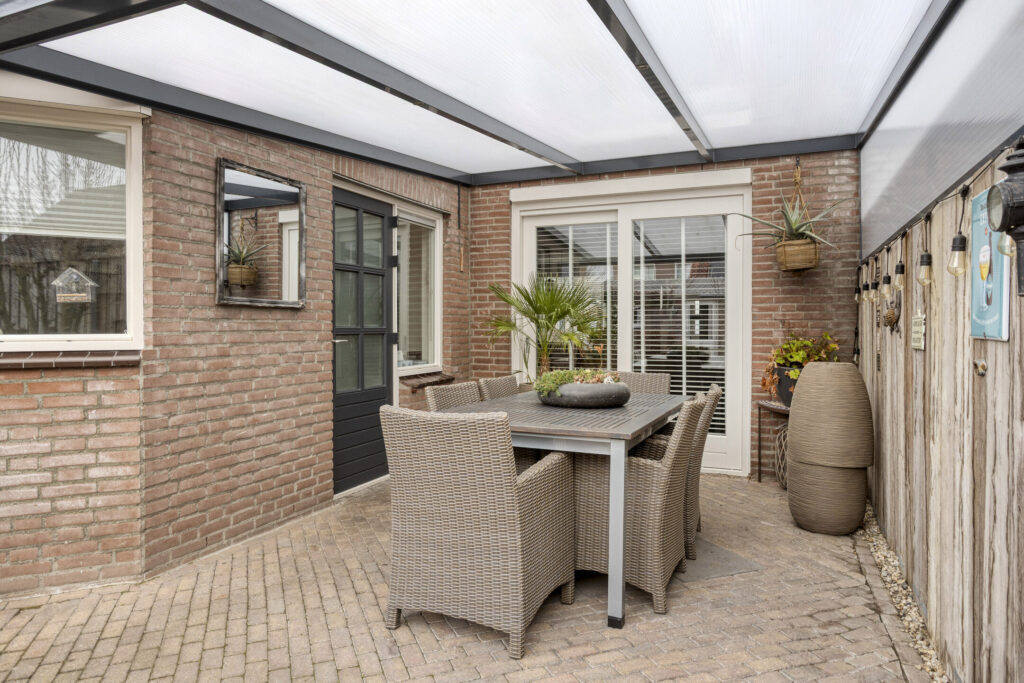 Achter in de tuin staat een ruime vrijstaande stenen berging, gebouwd in spouw en voorzien van dakisolatie en elektra. Via de berging is er een praktische achterom naar het achtergelegen pad.