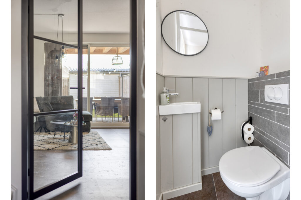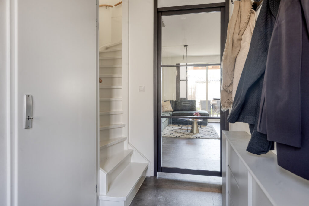 De gehele begane grond is afgewerkt met een stijlvolle 90×90 cm betonlook pvc vloer en strak afgewerkte wanden. In de entreehal bevinden zich de meterkast, het moderne toilet met fonteintje en de houten trapopgang naar de eerste verdieping.