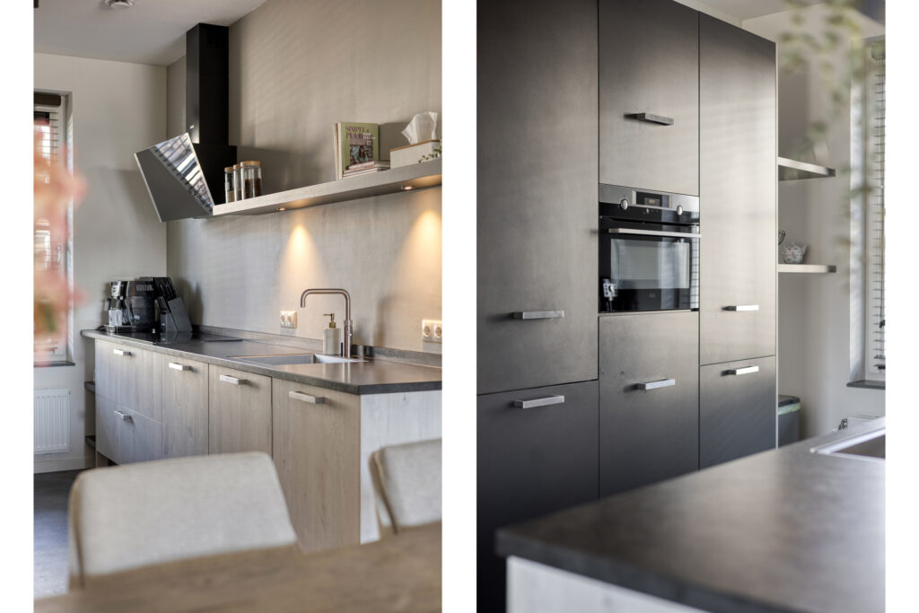 De moderne wandkeuken is ruim opgezet en voorzien van diverse inbouwapparatuur, waaronder een combimagnetron, koelkast, vriezer, quooker, vaatwasser en een inductiekookplaat met moderne afzuigkap. Daarnaast biedt de keuken volop werk- en opbergruimte.