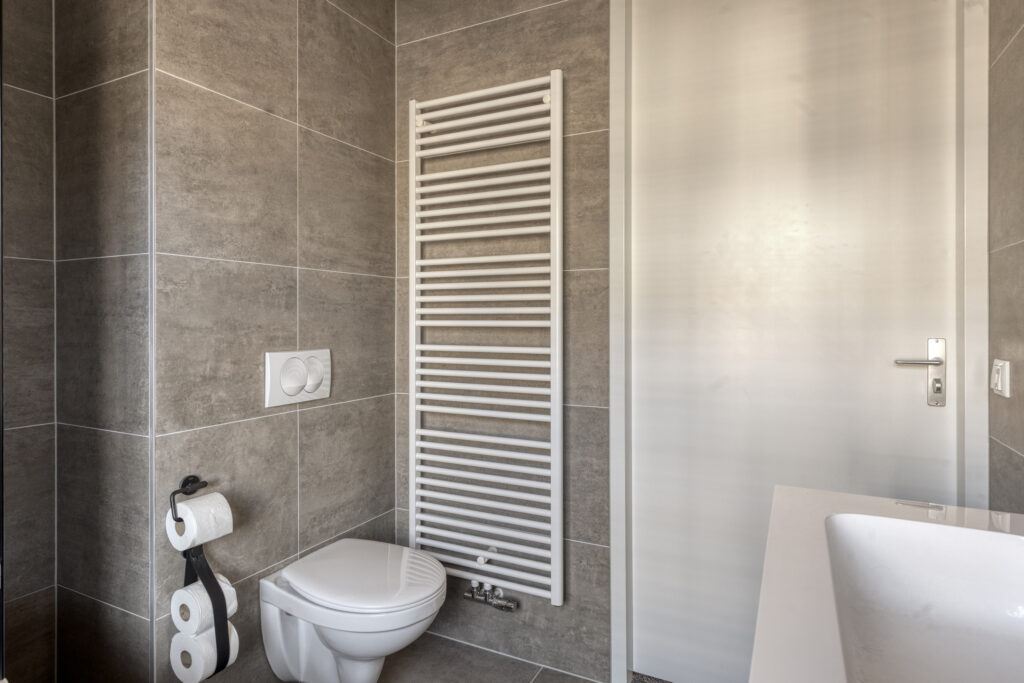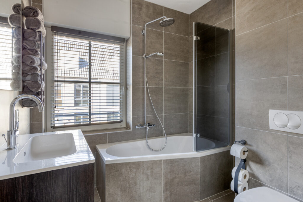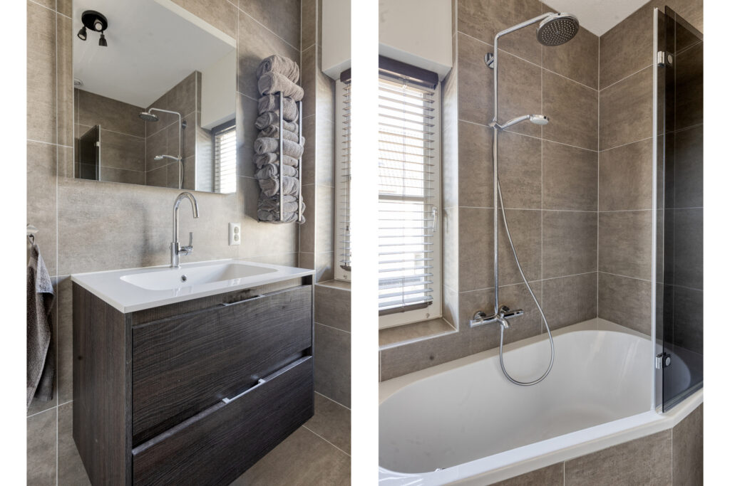 De moderne badkamer is stijlvol uitgevoerd en beschikt over een ligbad met thermostaatkraan, regendouche en spatscherm, een brede wastafel met meubel, een wandcloset en een designradiator. Daarnaast is er zowel natuurlijke als mechanische ventilatie aanwezig.