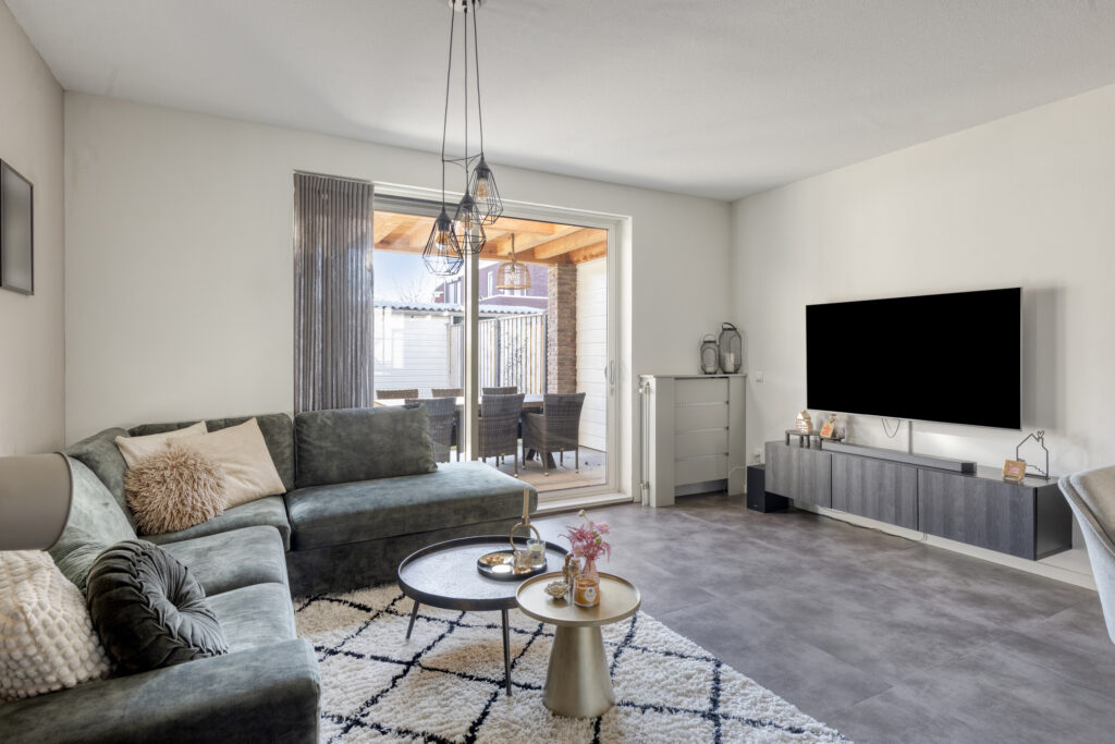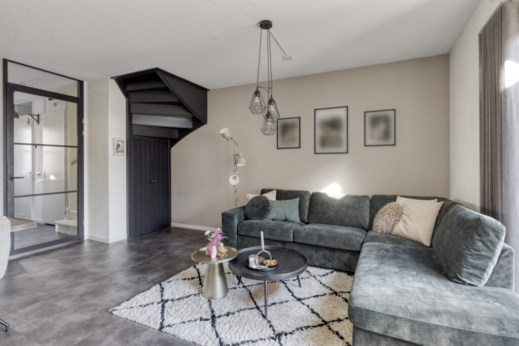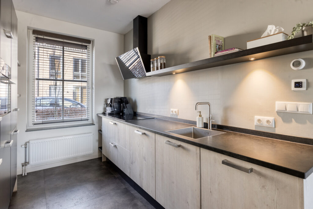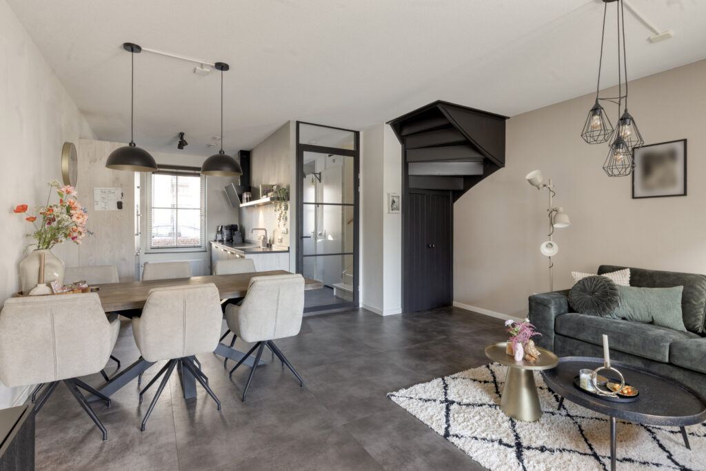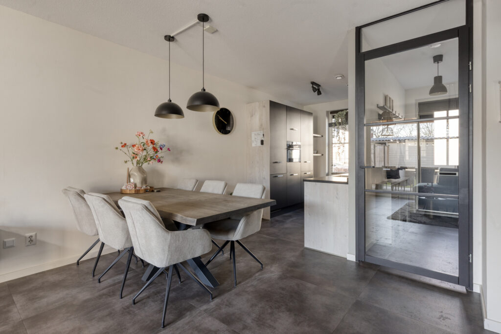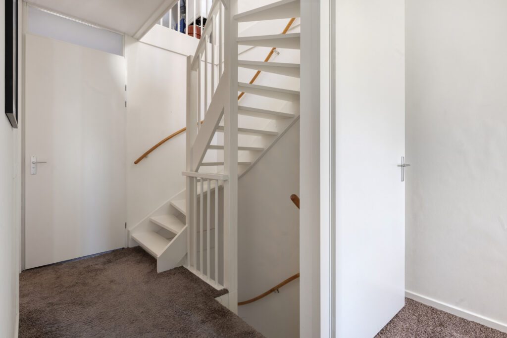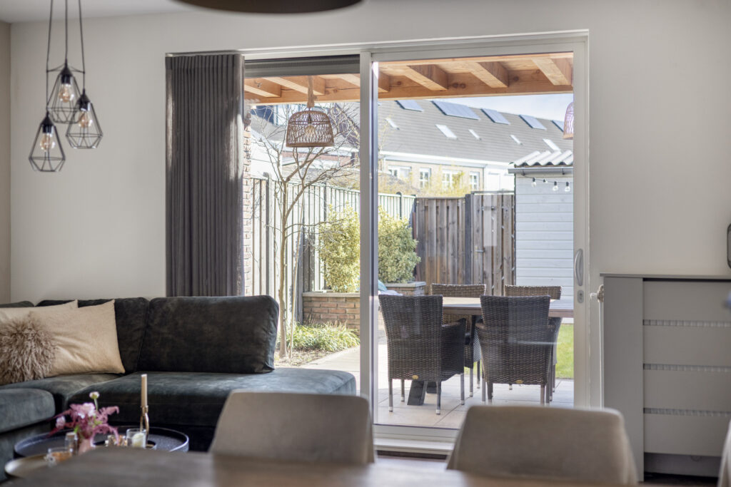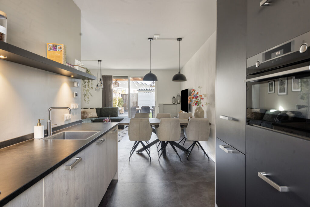Via een glazen zwartstalen deur bereik je de lichte woonkamer met open keuken. Dankzij de grote raampartijen aan zowel de voor- als achterzijde geniet de ruimte veel natuurlijke lichtinval. De schuifpui aan de achterzijde geeft direct toegang tot de tuin en de sfeervolle overkapping. Onder de trap bevindt zich een praktische trapkast met extra bergruimte.