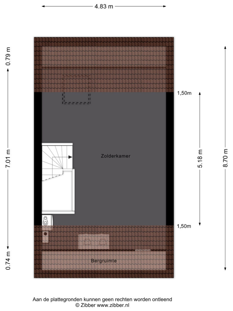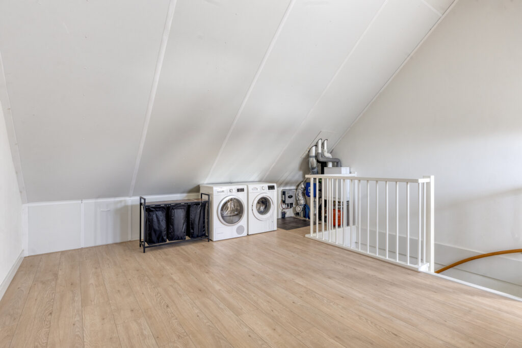 Op deze verdieping bevinden zich tevens de cv-ketel (2018), de mechanische ventilatie-unit, de omvormer van de zonnepanelen en de aansluitingen voor het wasapparatuur. Een dakraam zorgt voor aangenaam daglicht.