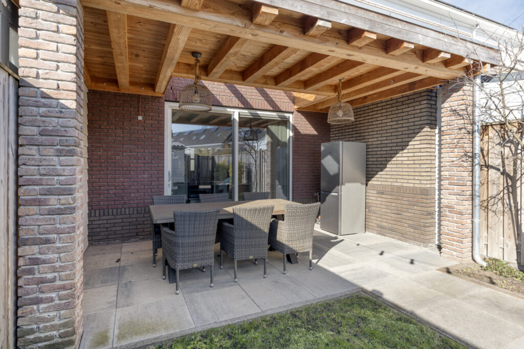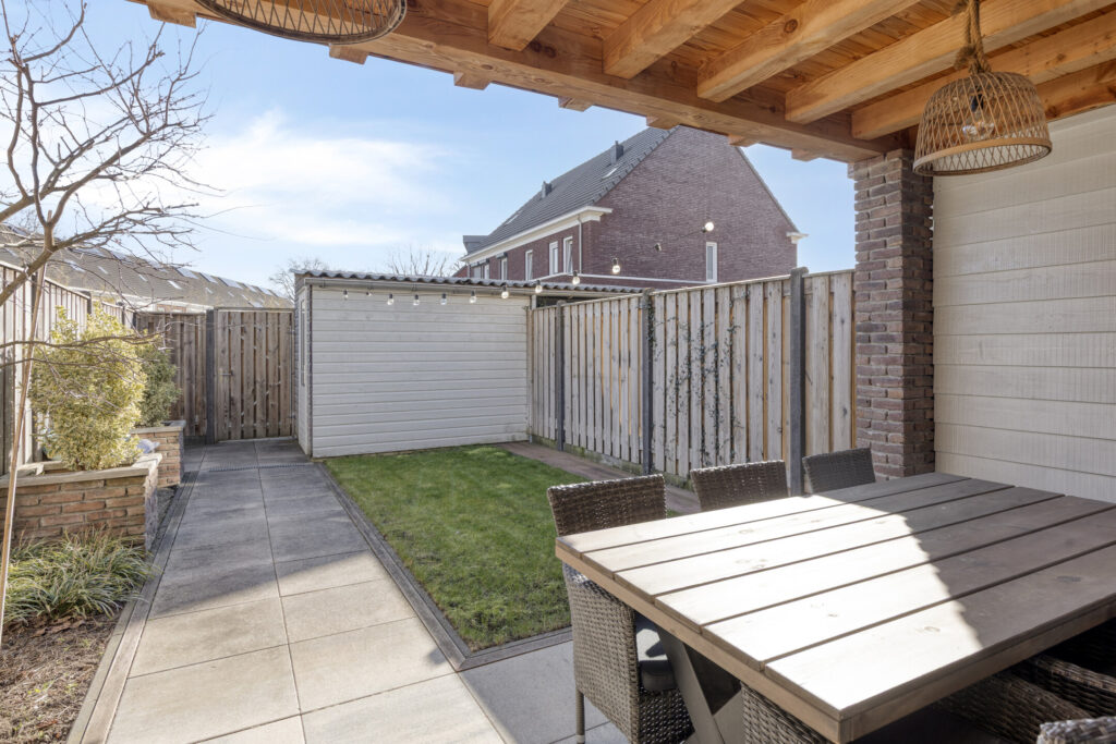 De achtertuin is bereikbaar via de schuifpui of via de achterom en is fraai aangelegd met sierbestrating en borders. De sfeervolle houten terrasoverkapping met lichtstraat zorgt ervoor dat je hier vrijwel het hele jaar door comfortabel buiten kunt zitten. Achterin de tuin bevindt zich een houten berging met elektra. Dankzij de houten erfafscheidingen heb je hier veel privacy.