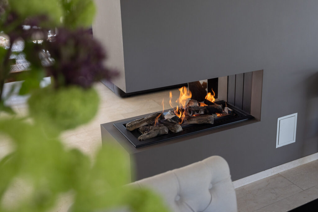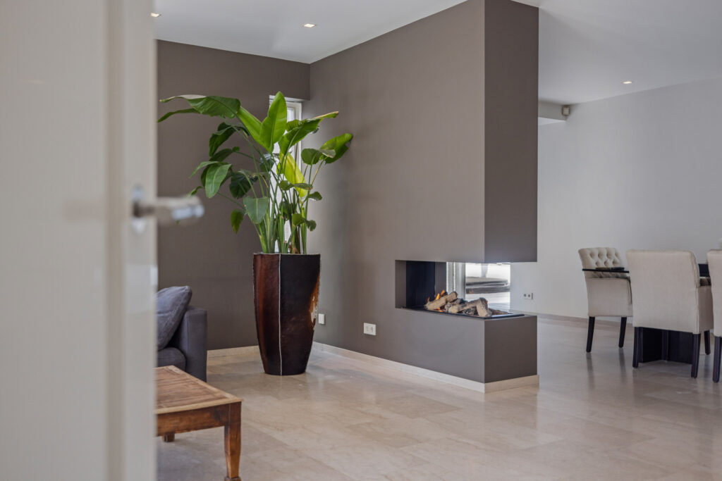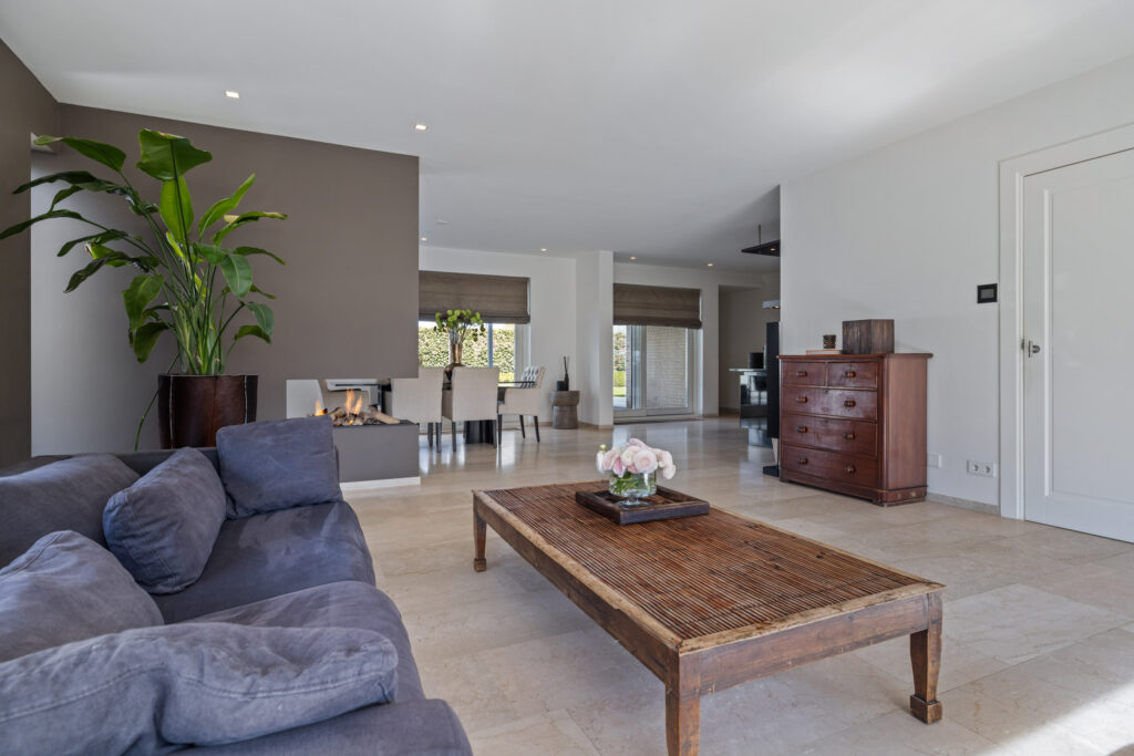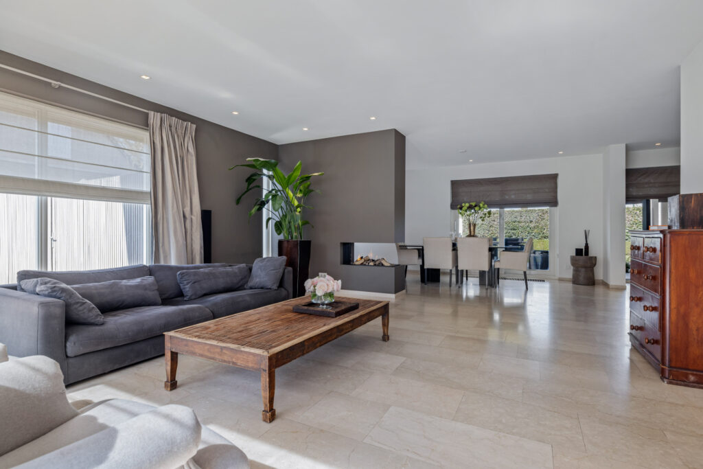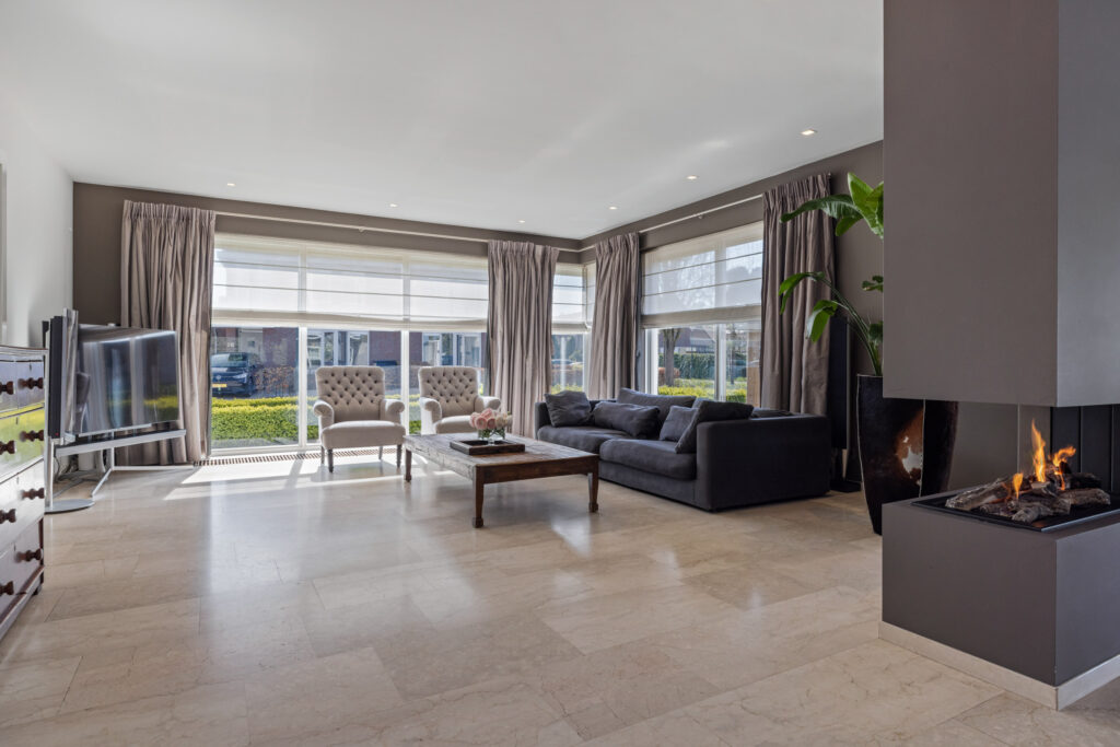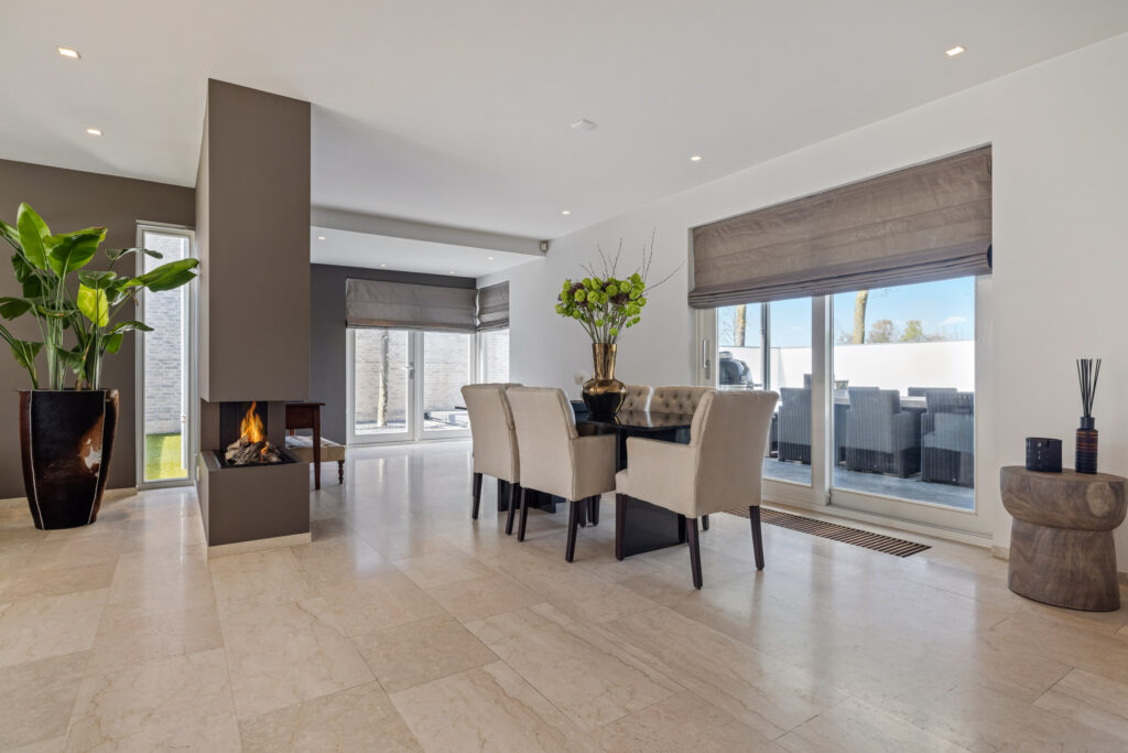 De woonkamer is ruim, licht en perfect in balans. Grote ramen aan de voor- en zijkant zorgen voor een prachtig uitzicht en een fijne lichtinval. De convectorputten dragen bij aan het strakke lijnenspel, terwijl de ingebouwde gashaard op een subtiele manier de ruimte verdeelt tussen de zithoek en de eethoek.