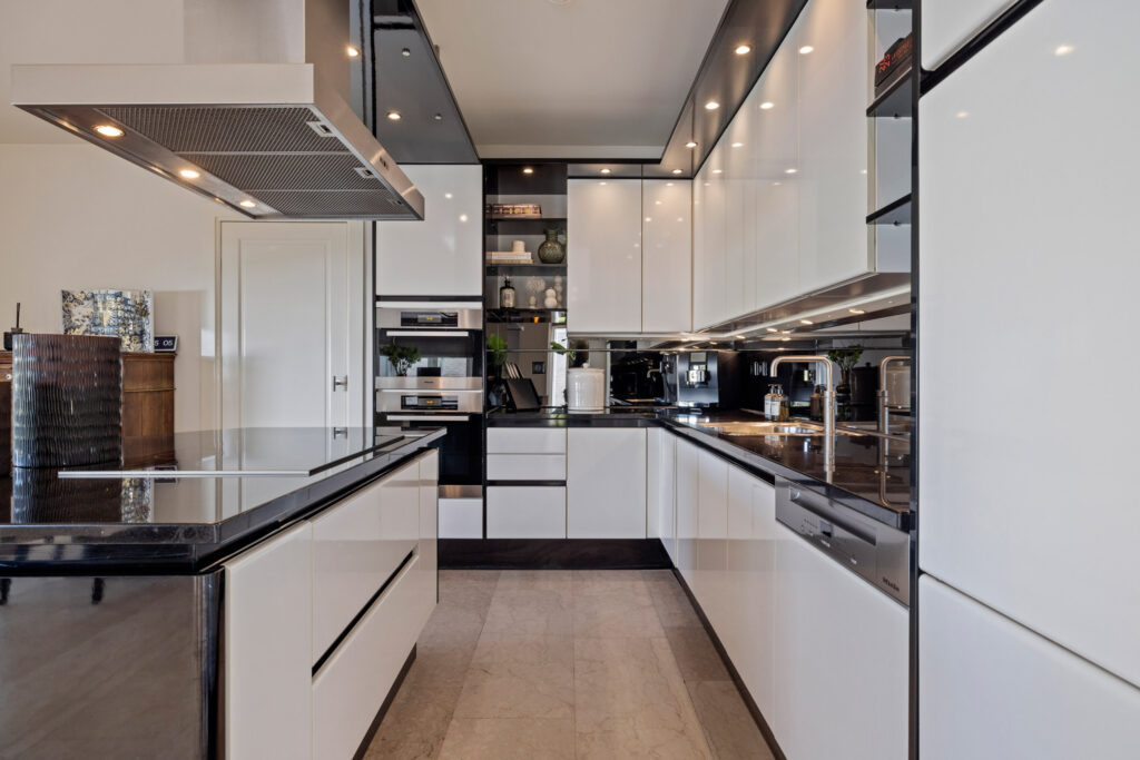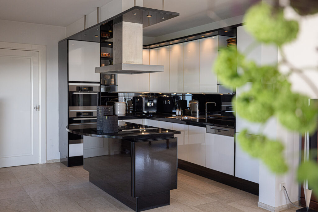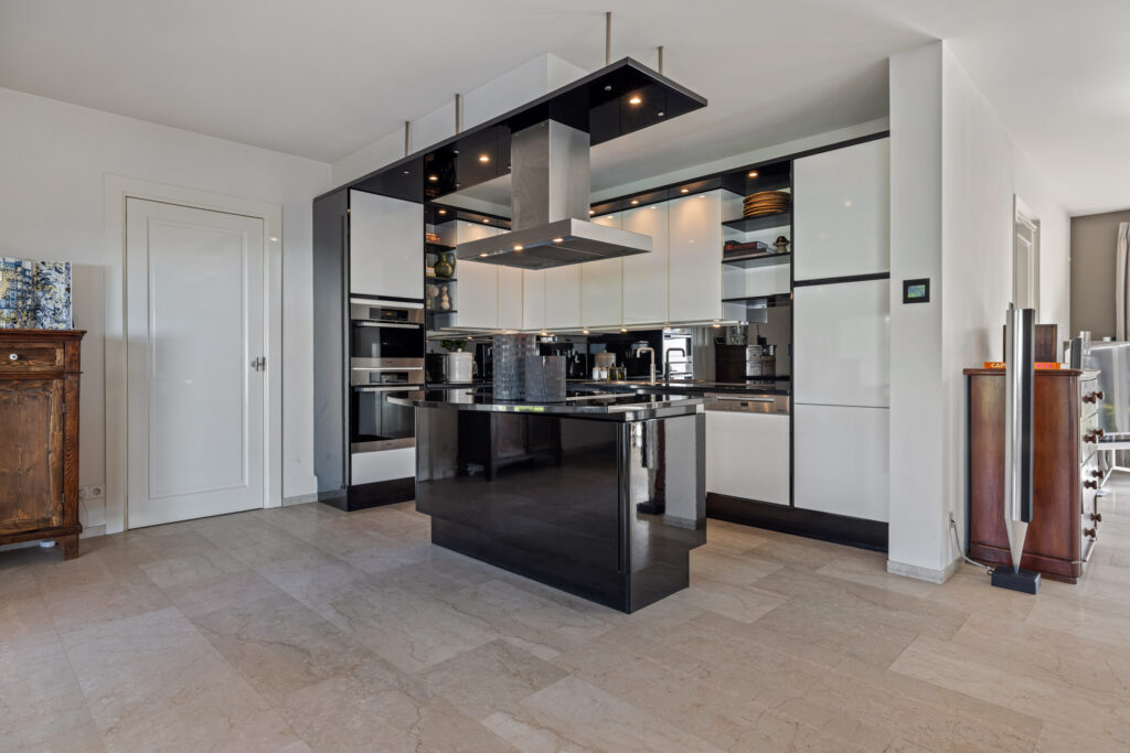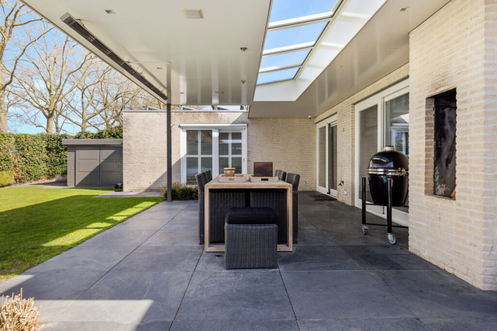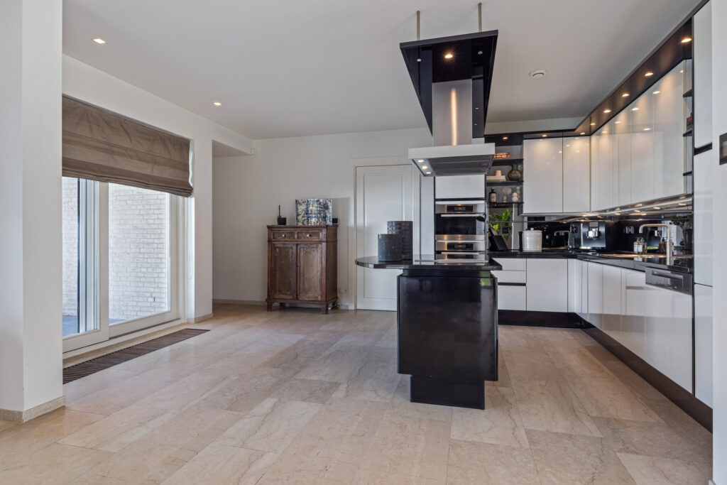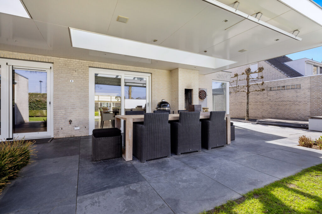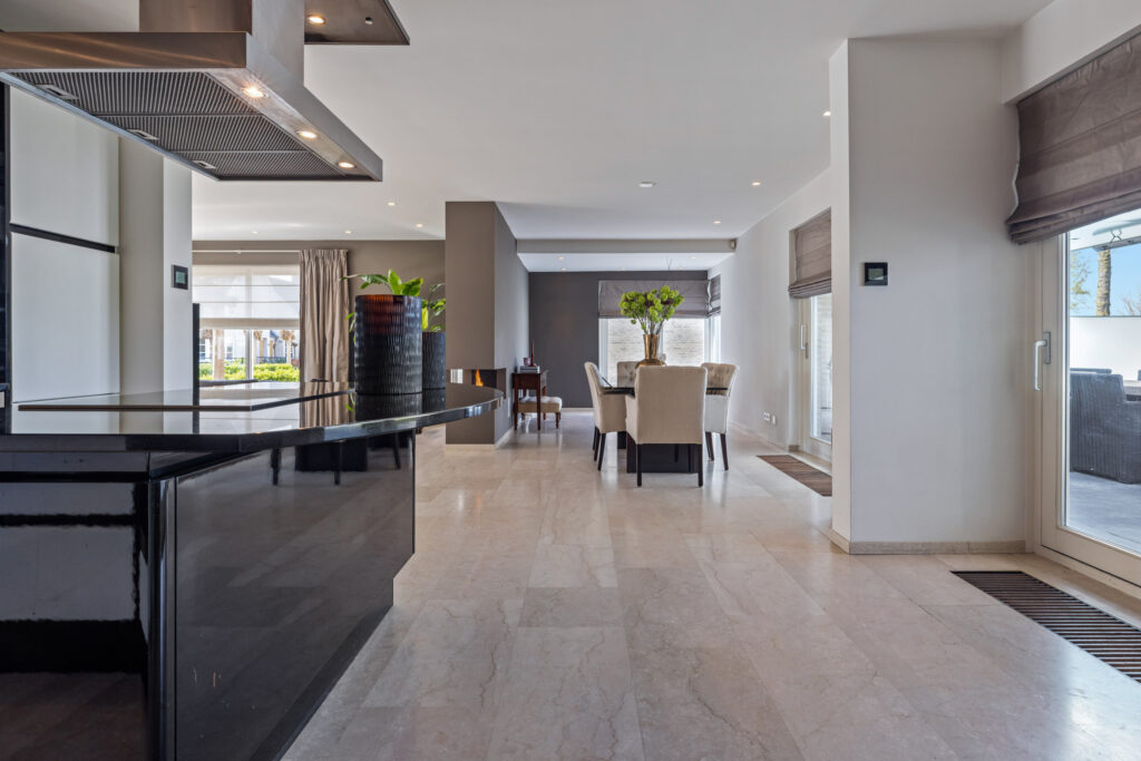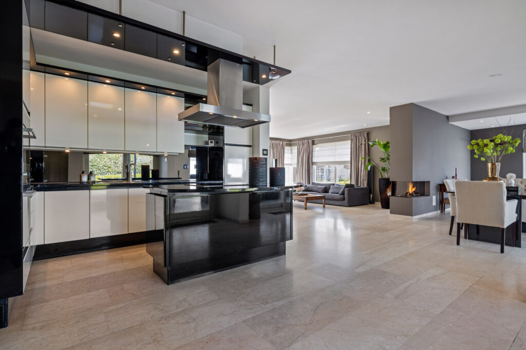 De eetkamer is een verlengstuk van de tuin. Dankzij de schuifpui en dubbele tuindeuren geniet je hier van een naadloze overgang tussen binnen en buiten. De open keuken sluit hier perfect op aan. Deze is uitgerust met een groot kookeiland, luxe inbouwapparatuur zoals een inductiekookplaat, oven, stoomoven, vaatwasser, Quooker en koelkast en een natuurstenen werkblad. Vanuit de keuken heb je een mooi zicht op de tuin én contact met de rest van de leefruimte – ideaal voor wie houdt van koken en gezelligheid.