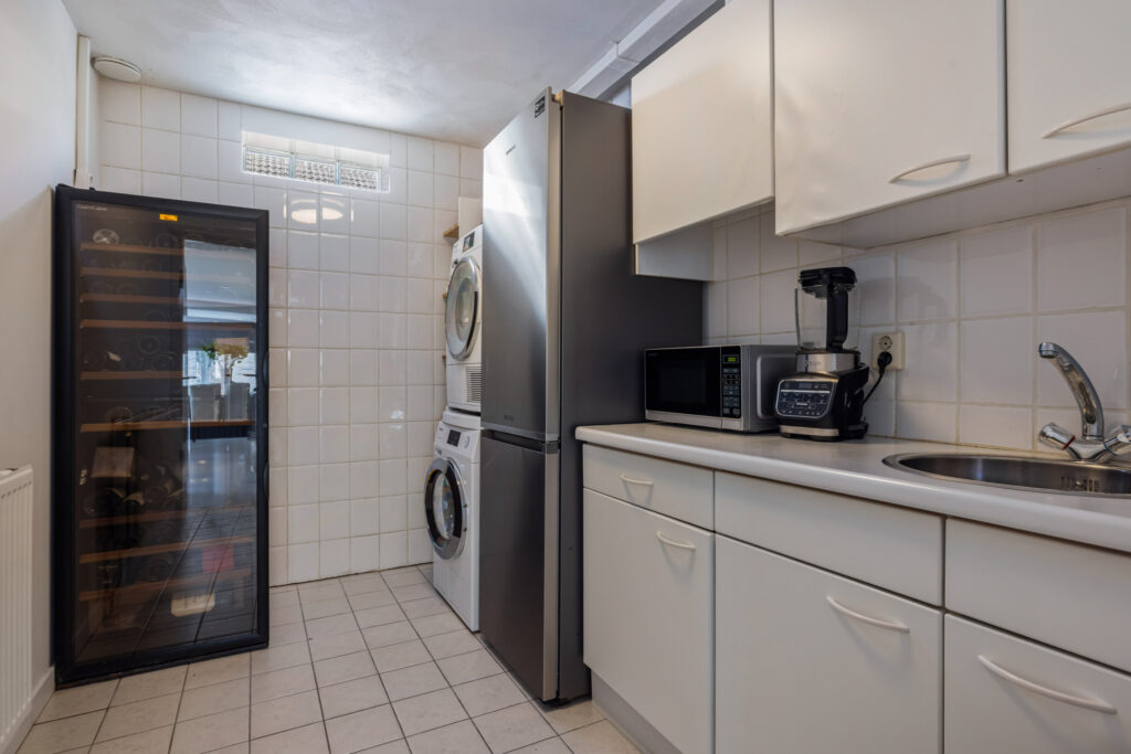 De bijkeuken ligt direct achter de keuken en biedt volop praktische ruimte. Hier vind je onder meer aansluitingen voor de wasmachine en droger en een keukenblok met een spoelbak en een afzuigkap.