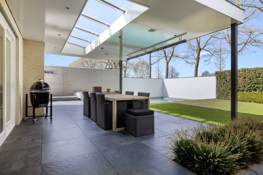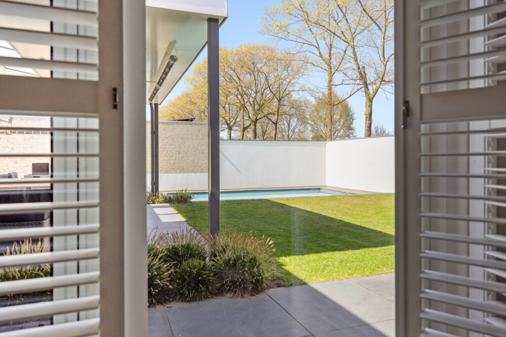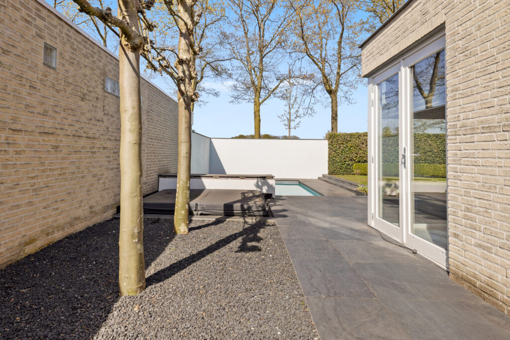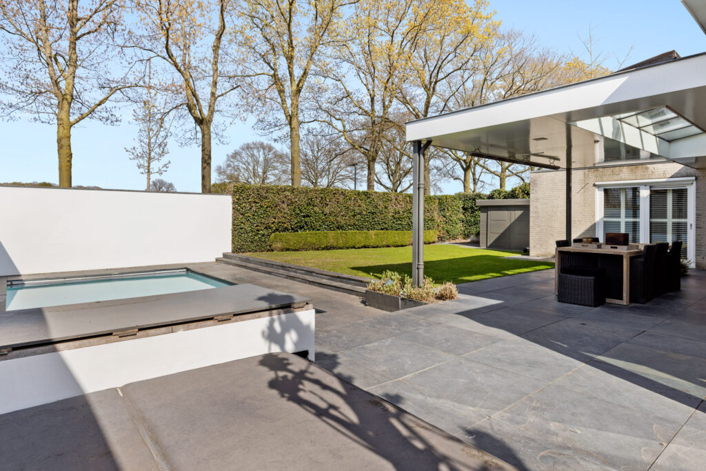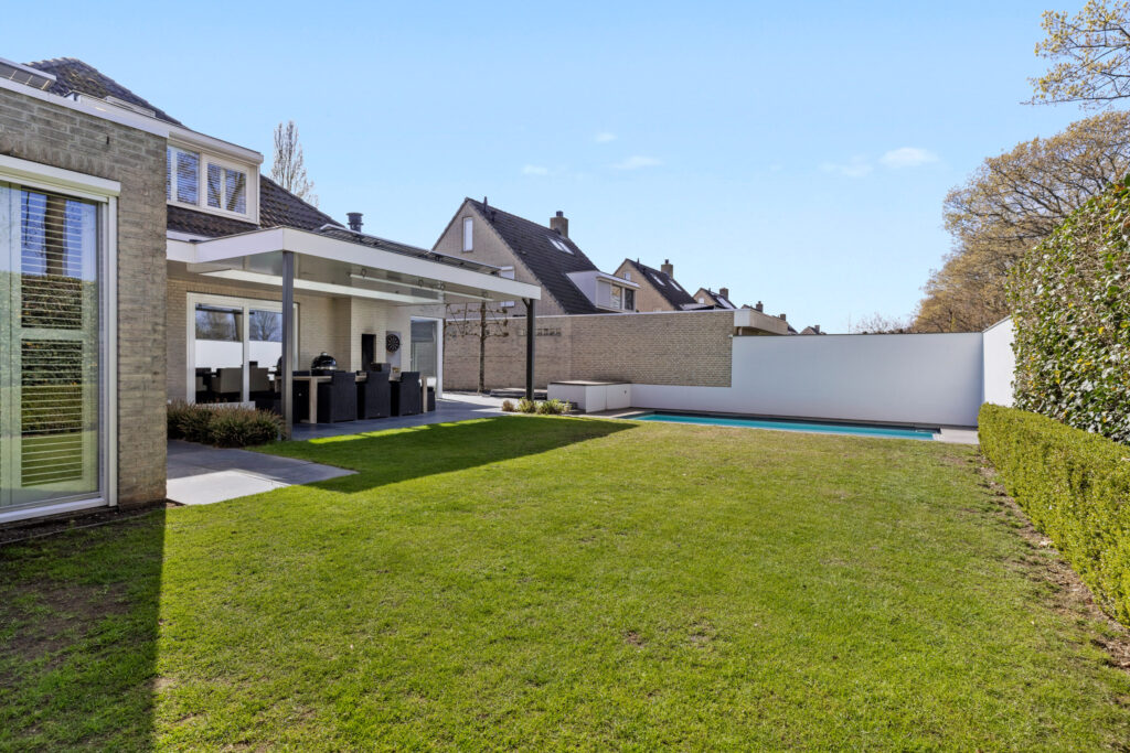 De achtertuin is echt een blikvanger! Gelegen op het noordoosten, met volledige privacy en een prachtig uitzicht over de weilanden. Hier vind je een ruime overkapping met een openhaard, lichtstraat, inbouwverlichting, elektrische terrasverwarming en geïntegreerde speakers – een perfecte plek voor lange zomeravonden. Het zwembad zorgt voor verfrissing op warme dagen, terwijl de combinatie van natuur- en kunstgras, sfeervolle borders en split zorgt voor een onderhoudsvriendelijk én stijlvol geheel. Verder zijn er een berging en een achterom aanwezig.