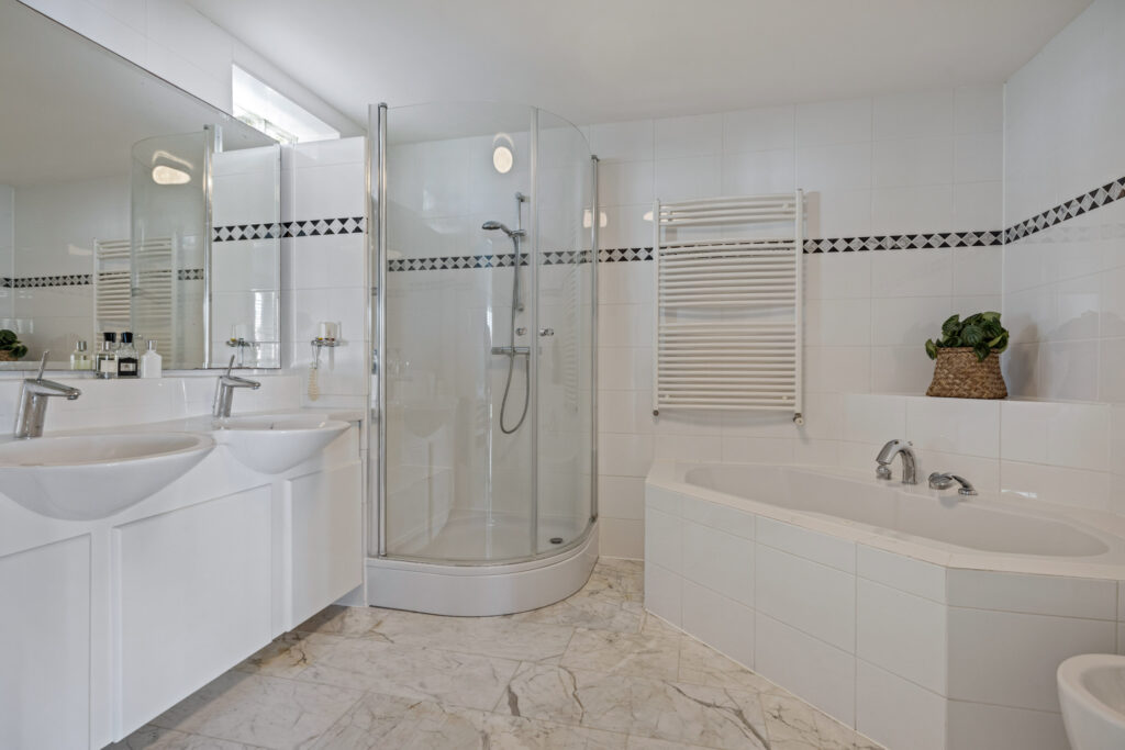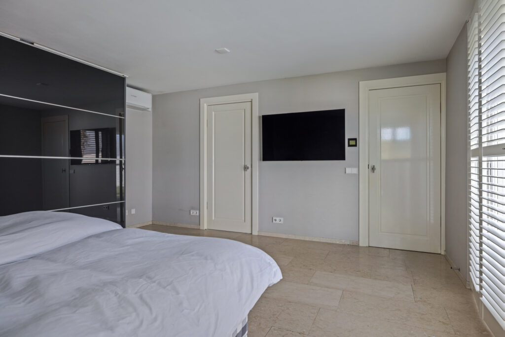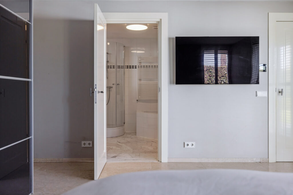 De master bedroom is een oase van rust. Deze royale slaapkamer ligt op de begane grond en beschikt over een schuifdeur naar de tuin, airconditioning en shutters. Aangrenzend vind je een luxe badkamer met een inloopdouche, ligbad, bidet, wandcloset en een dubbele wastafel. Comfort en stijl gaan hier hand in hand.