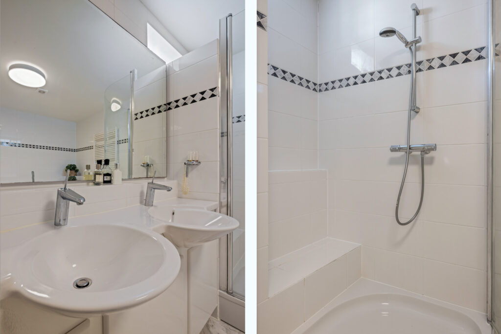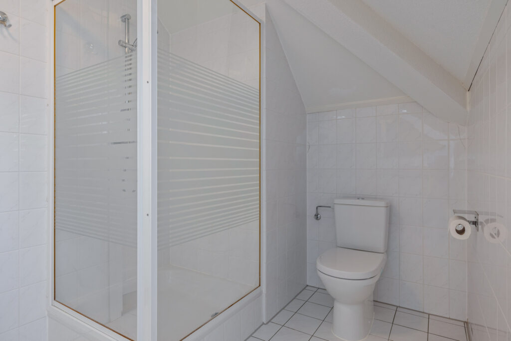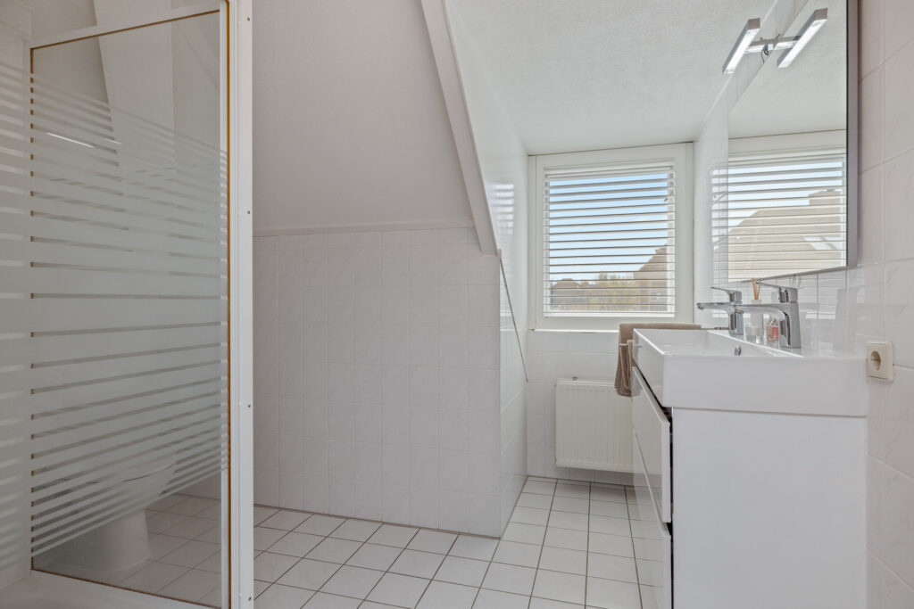 Badkamer 2 is compleet ingericht met een douchecabine, closet en een dubbele wastafel in een meubel. Ook deze ruimte is netjes afgewerkt en beschikt over een dakkapel.