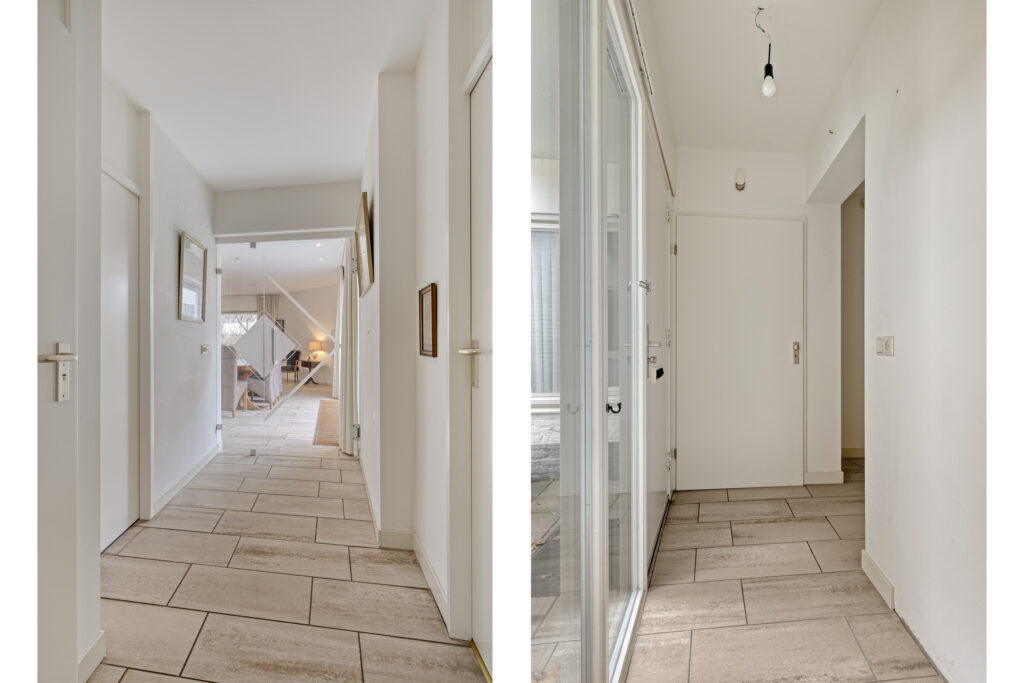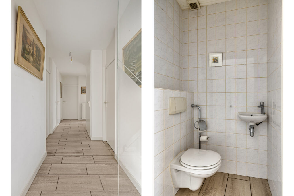U betreedt de woning via de overdekte entree, die uitkomt in de centrale hal. Vanuit hier heeft u toegang tot alle vertrekken, waaronder het toilet en de badkamer. Het toilet is volledig betegeld en voorzien van een fonteintje.