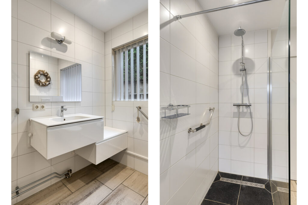 De badkamer is praktisch ingedeeld en is erg licht dankzij het grote raam. De ruimte is voorzien van een inloopdouche, een vaste wastafel met meubel, een hangtoilet met bidetfunctie en mechanische ventilatie.