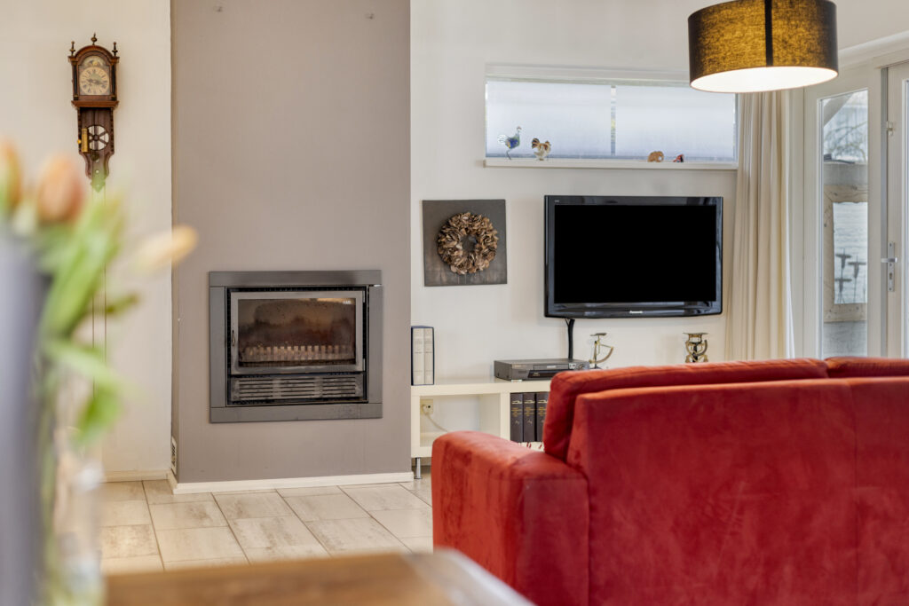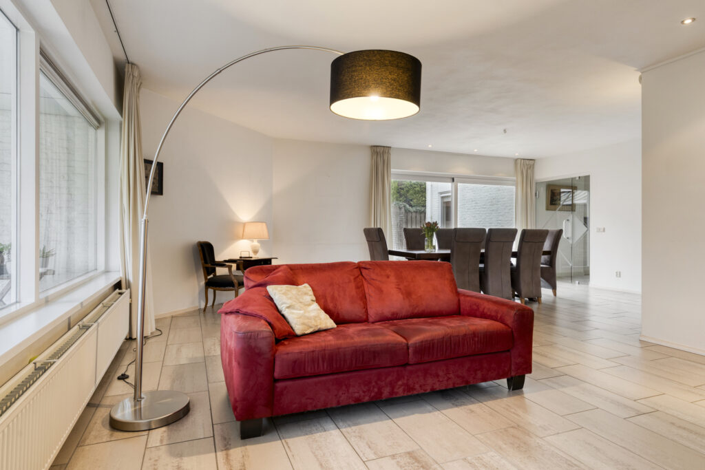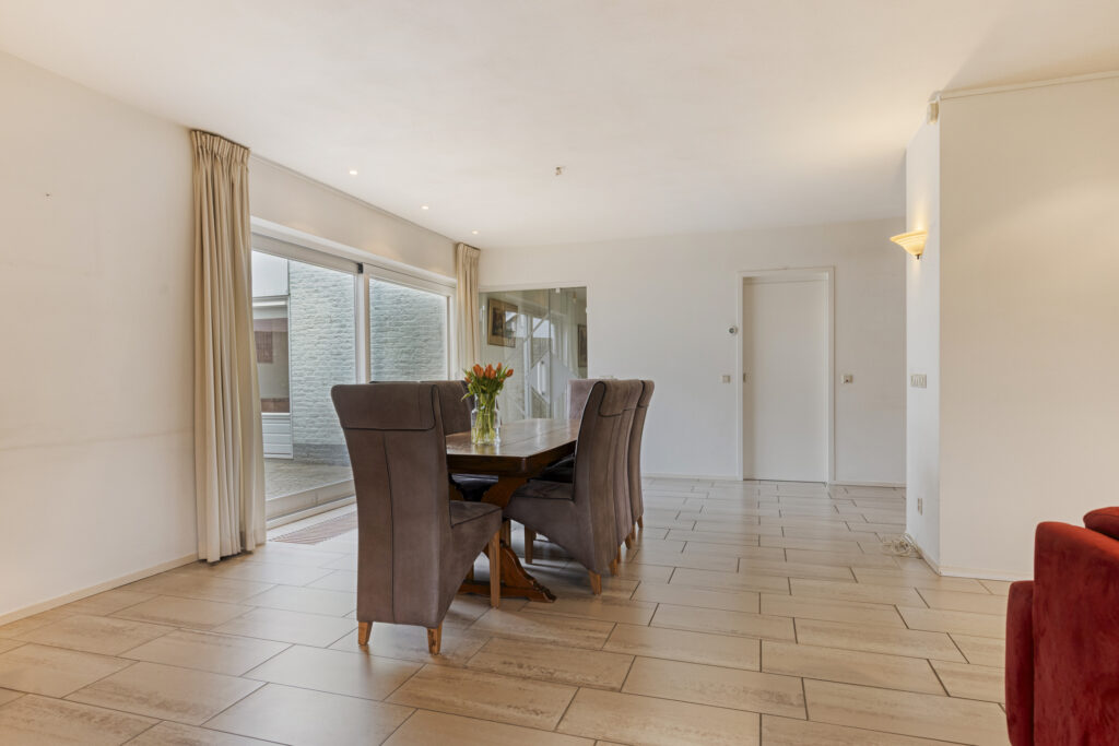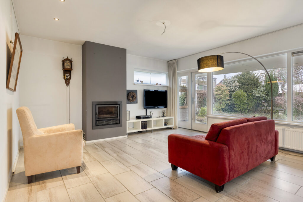 Vanuit de hal loopt u via een glazen deur door naar de ruime en lichte woonkamer. Dankzij de grote raampartijen is de ruimte erg licht. De woonkamer is afgewerkt met grote plavuizen en strak gestucte wanden met inbouwspots. Een sfeervolle houtkachel zorgt voor extra warmte en gezelligheid. Vanuit de woonkamer heeft u direct toegang tot zowel de achtertuin als de beschutte binnenplaats.