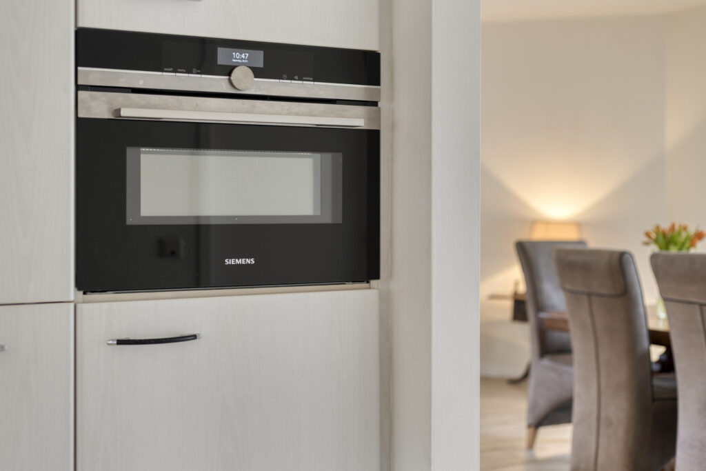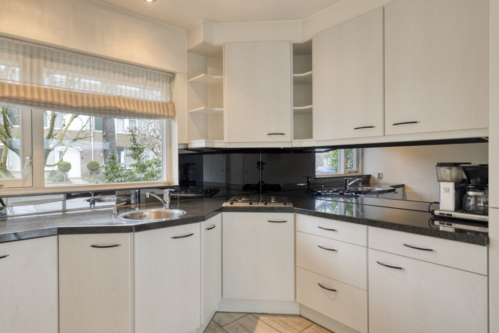 De open keuken bevindt zich aan de voorzijde van de woning, met een uitzicht op de straat. De keuken is praktisch ingericht en volledig uitgerust met een vaatwasser, RVS spoelbak, vierpits gaskookplaat, apothekerskast, koelkast, combi-oven en vlakscherm afzuigkap. Het natuurstenen werkblad en de ruime boven- en onderkasten bieden volop werk- en bergruimte, waardoor koken hier erg prettig wordt.