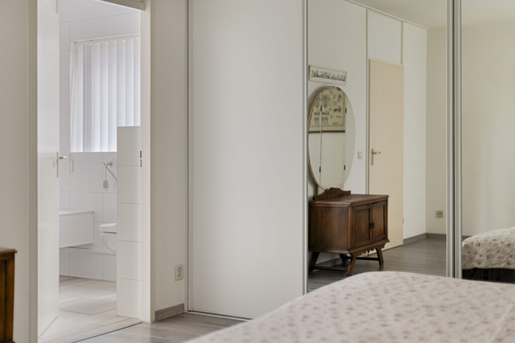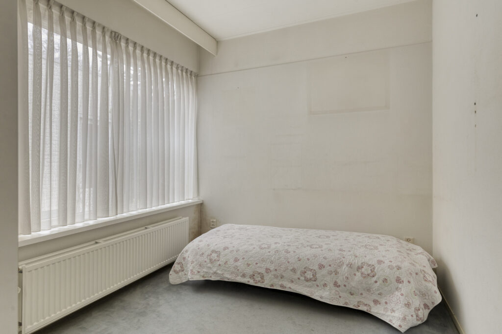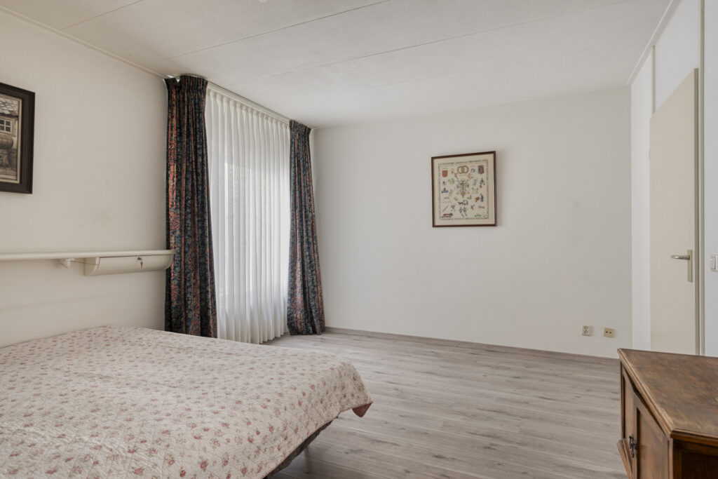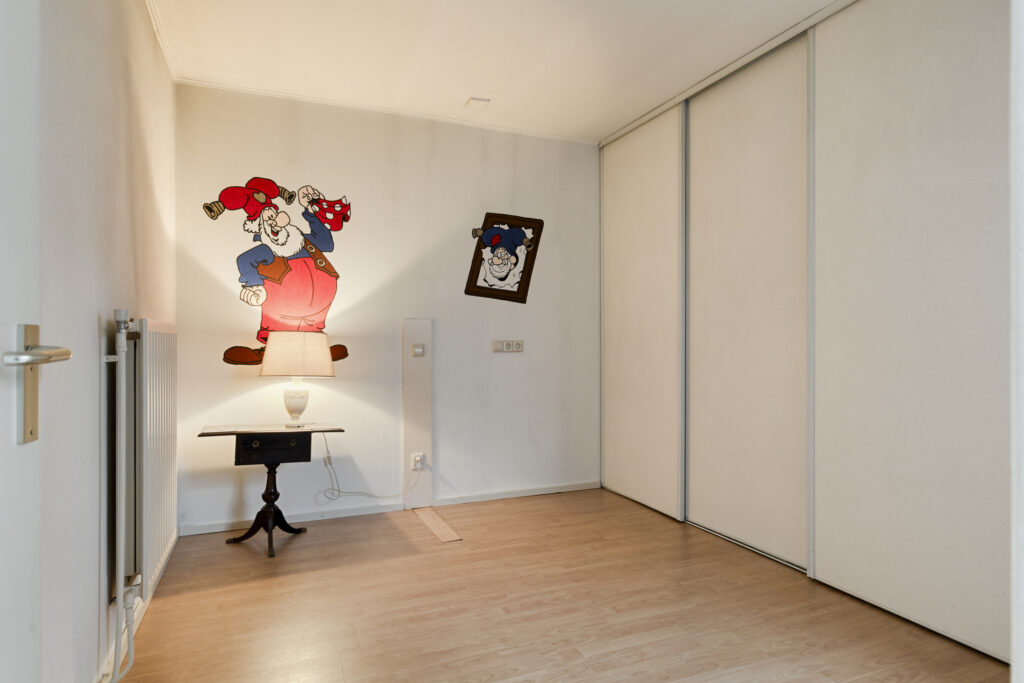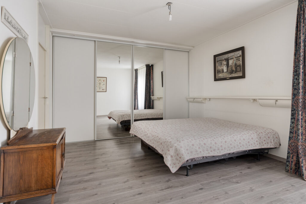 De vierde slaapkamer is gerealiseerd in de voormalige garage en functioneert als volwaardige extra kamer. Deze ruimte is voorzien van een grote vaste schuifdeurkast, een laminaatvloer en spuitwerk wanden.