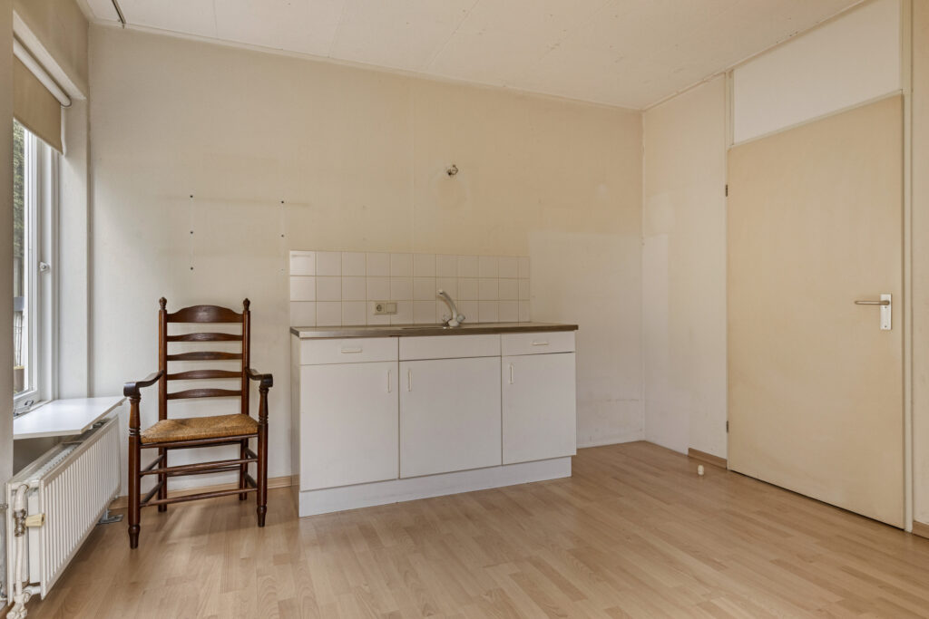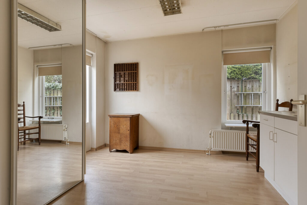 De tweede slaapkamer is iets compacter en voorzien van een laminaatvloer, vaste kast en spuitwerk wanden. Tevens is er een keukenblok met werkende kraan en afvoer aanwezig, waardoor de kamer uitstekend geschikt is als hobbykamer, werkkamer of kantoor. Daarnaast bestaat de mogelijkheid om hier een deur naar de achtertuin te realiseren, wat extra functionaliteit biedt.