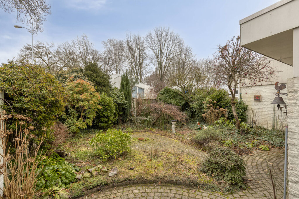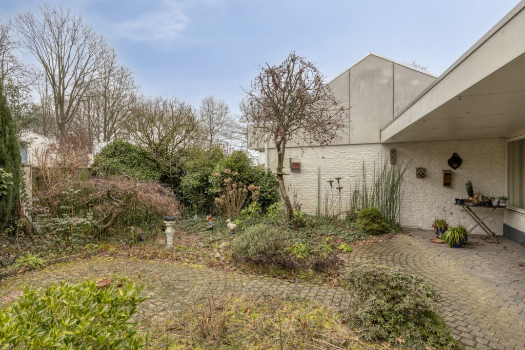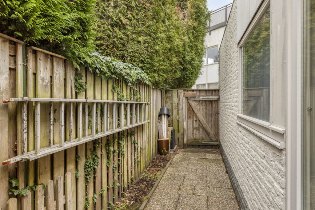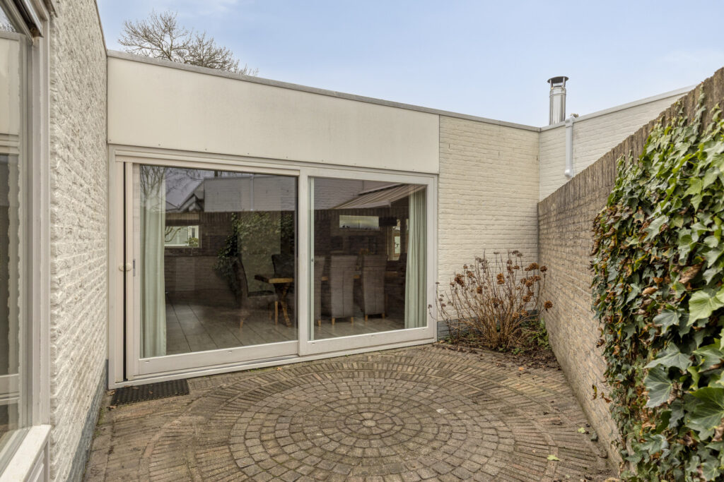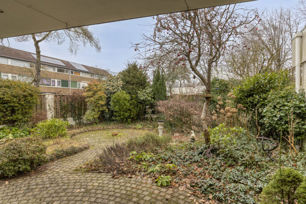 De woning beschikt over een verzorgde voortuin, een ruime achtertuin en een beschutte binnenplaats met achterom. De achtertuin ligt op het oosten en biedt veel privacy, met volwassen beplanting, diverse terrasmogelijkheden en een royale overkapping. Achterin de tuin staat een houten tuinhuis, ideaal voor opslag. Aan de voorzijde bevindt zich een praktische berging, onderdeel van de voormalige garage, en langs de zijkant van de woning loopt een gangpad. Parkeren is eenvoudig op eigen terrein, waardoor de woning zowel binnen als buiten veel comfort en functionaliteit biedt.
