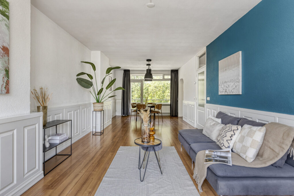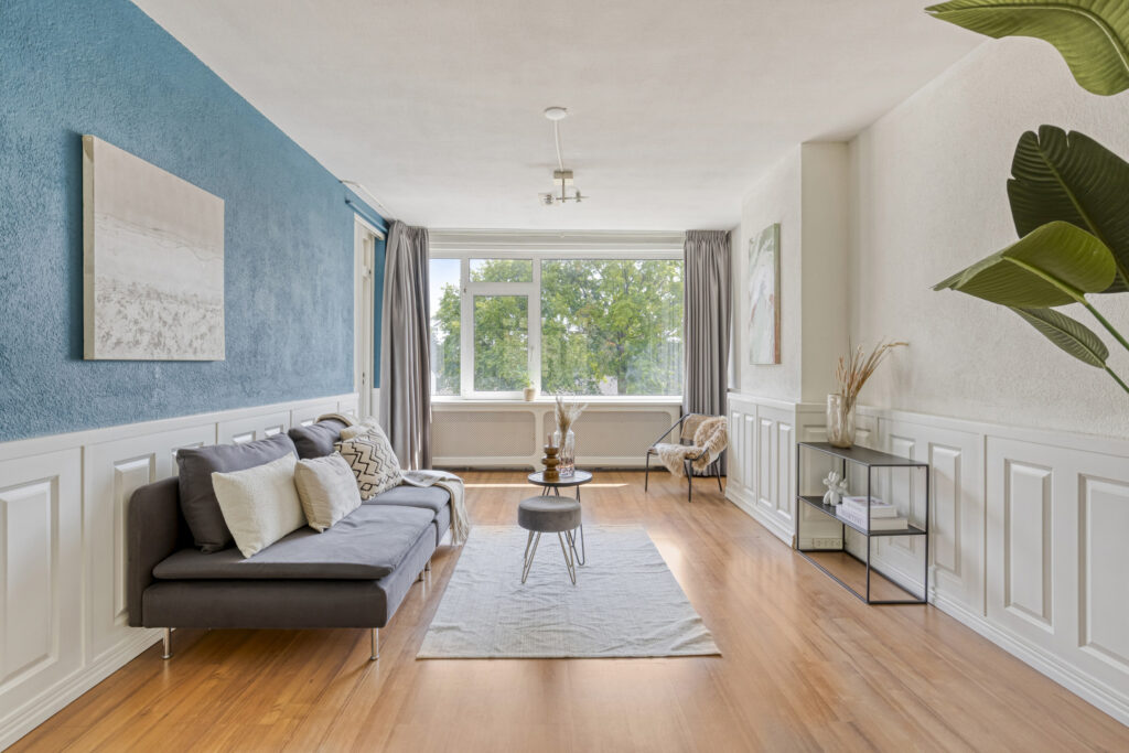 Vanuit de hal stapt u de lichte woonkamer binnen, waar de laminaatvloer en de nette afwerking meteen voor een prettige sfeer zorgen. De wanden zijn deels voorzien van een chique lambrisering, wat de ruimte extra karakter geeft. Zowel aan de voorzijde als aan de achterzijde heeft u toegang tot een overdekt balkon. Aan de achterzijde geniet u bovendien van een fraai uitzicht op het Philips van Lenneppark.