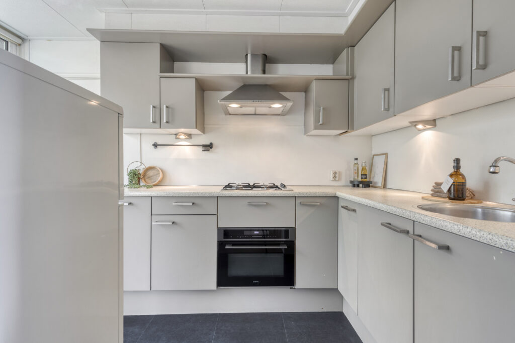 Vanuit de woonkamer bereikt u de keuken. Deze is modern en praktisch ingedeeld in een L-opstelling en afgewerkt met een antracietkleurige vloer. U beschikt hier over een vaatwasser, gaskookplaat met afzuigkap, een combi-oven en volop bergruimte. Het merendeel van de inbouwapparatuur is vernieuwd in 2018 en de combi-oven is in 2024 geplaatst, waardoor u de komende jaren zorgeloos kunt koken en bakken.