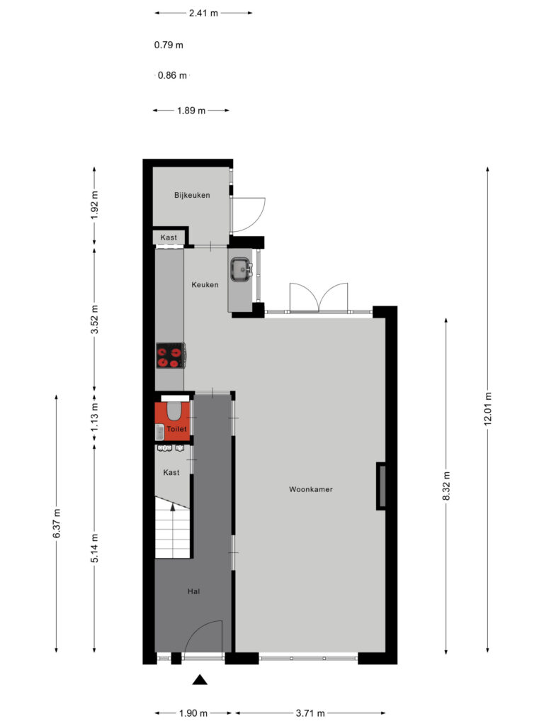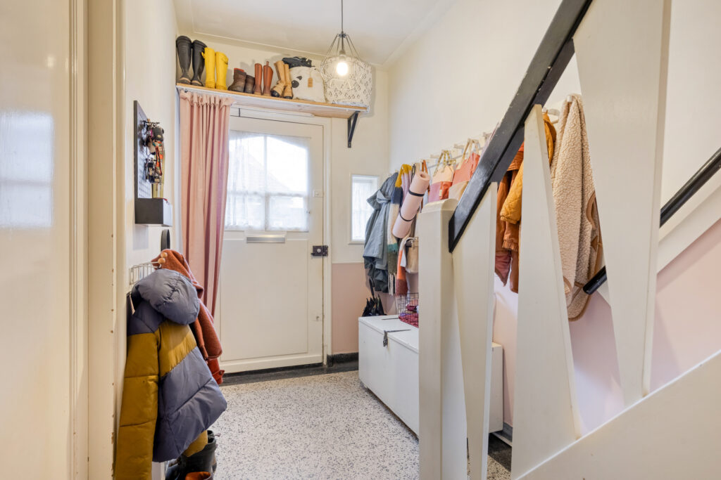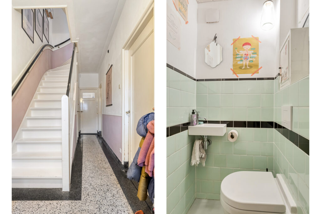 Entree. In de ontvangsthal, voorzien van een fraaie originele terrazzovloer, bevinden zich de trapopgang naar de eerste verdieping en een praktische trapkast met de meterkast. Tevens is hier de halfhoog betegelde toiletruimte met een wandcloset en fonteintje gelegen. Vanuit de hal zijn de woonkamer en de keuken te bereiken.