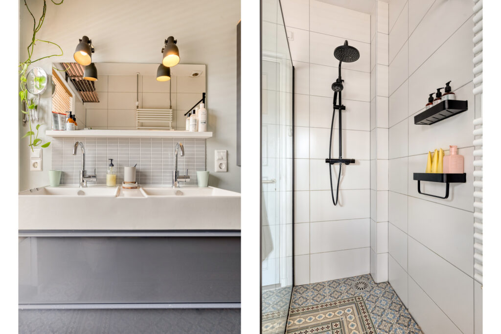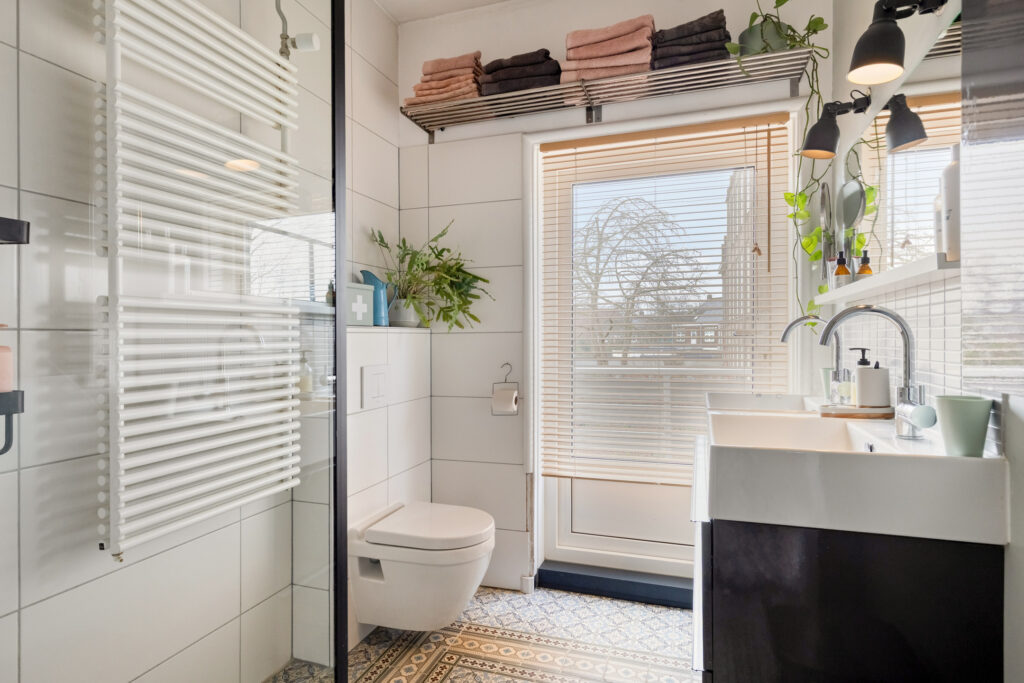 De badkamer is uitgerust met een inloopdouche met een thermostaatkraan, regendouche en handdouche, een wandcloset, een wastafelmeubel met een dubbele wastafel en een designradiator. Het geheel is uitgevoerd met lichte wandbetegeling, stucwerk en mooie kleurrijke vloertegels. Aansluitend is een balkon gelegen.
