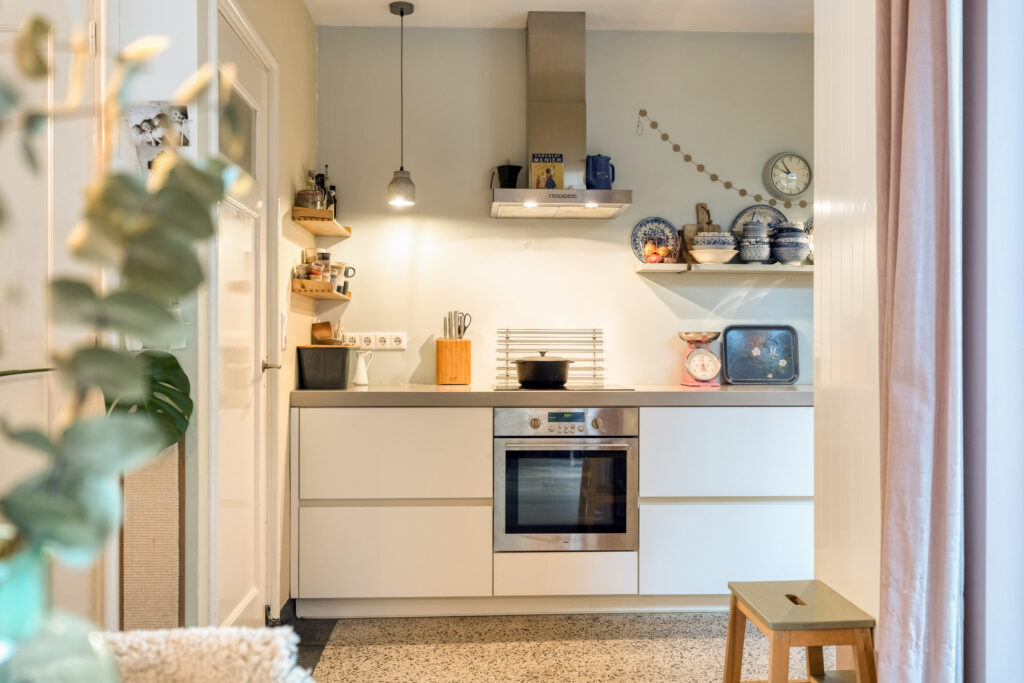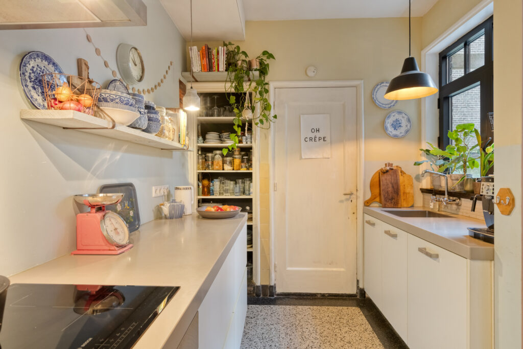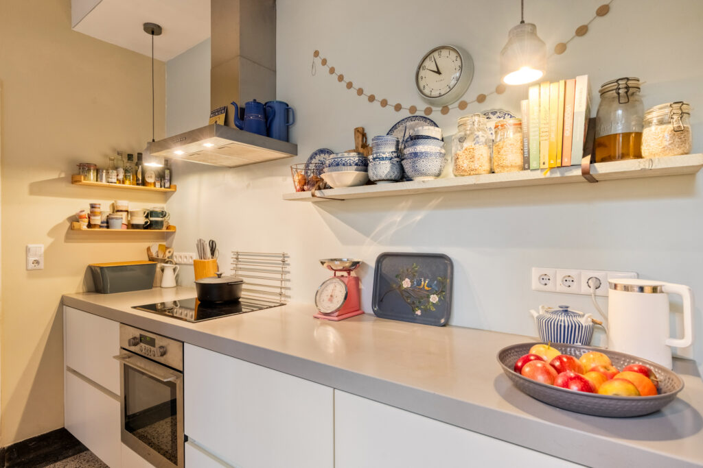 De open keuken is voorzien van een moderne en lichte keukeninrichting met een composiet aanrechtblad, spoelbak, inductie kookplaat, afzuigkap, oven, vaatwasser en een elektrische boiler. De diverse lades en kasten, alsmede een inbouwkast, bieden voldoende bergruimte. De fraaie originele terrazzovloer maakt de keuken helemaal af.