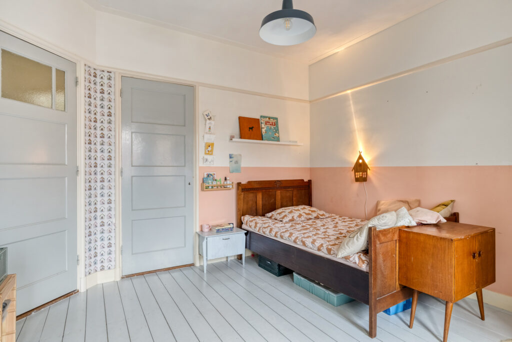 Slaapkamer 1 is een ruime slaapkamer van circa 13,5 m² en is aan de voorzijde gelegen. Deze kamer is voorzien van een houten vloer, een inbouwkast en een drietal raampartijen met roedeverdeling.