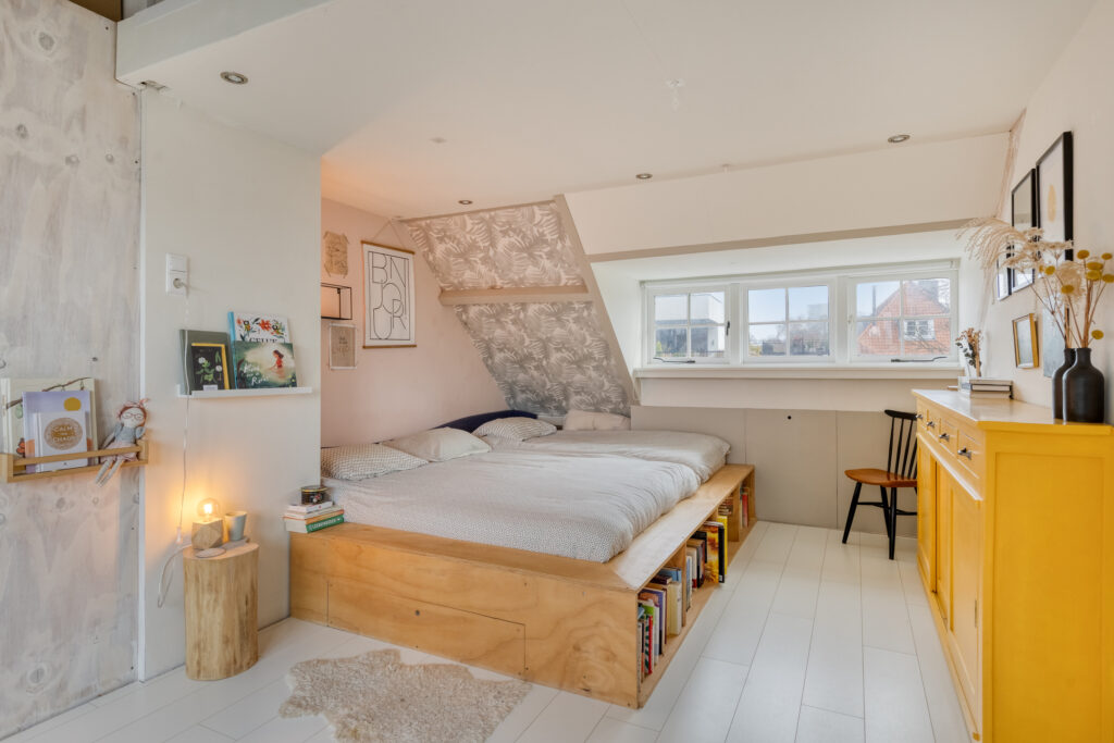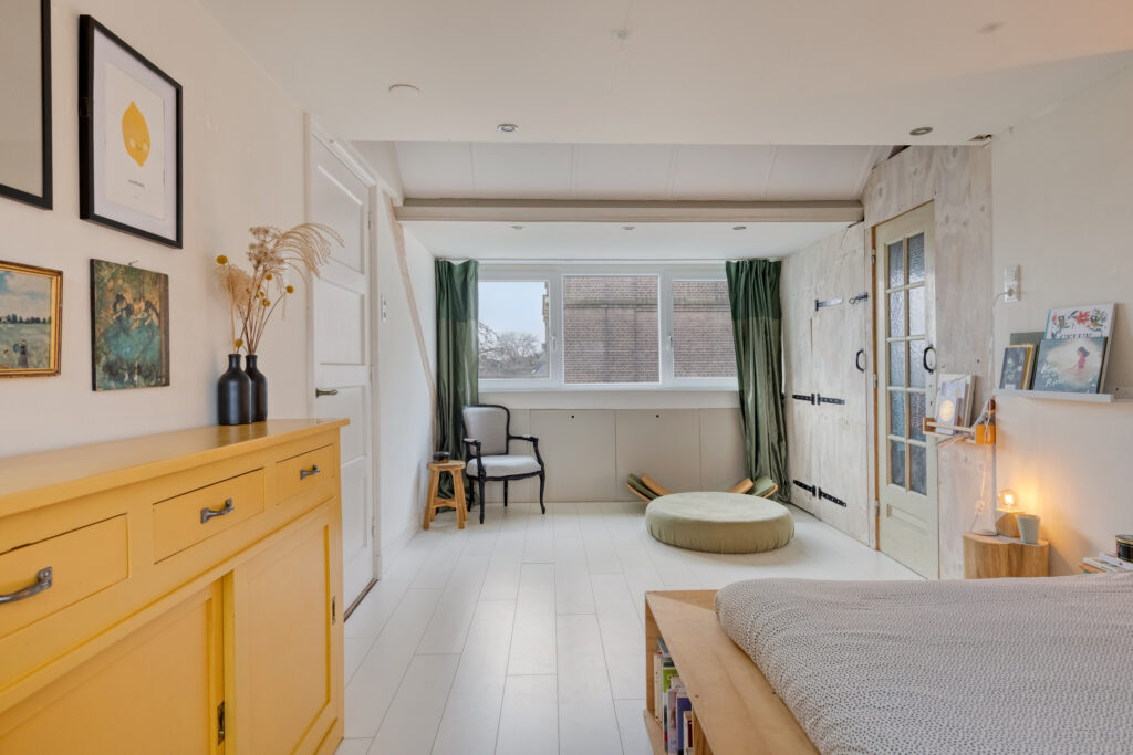 De slaapkamer heeft een oppervlakte van circa 18 m² en is voorzien van een lichte laminaatvloer, een dakkapel aan de voorzijde (hout, HR beglazing), dakkapel aan de achterzijde (kunststof, HR++ beglazing), inbouwkasten en bergruimte onder de kapschuinten.