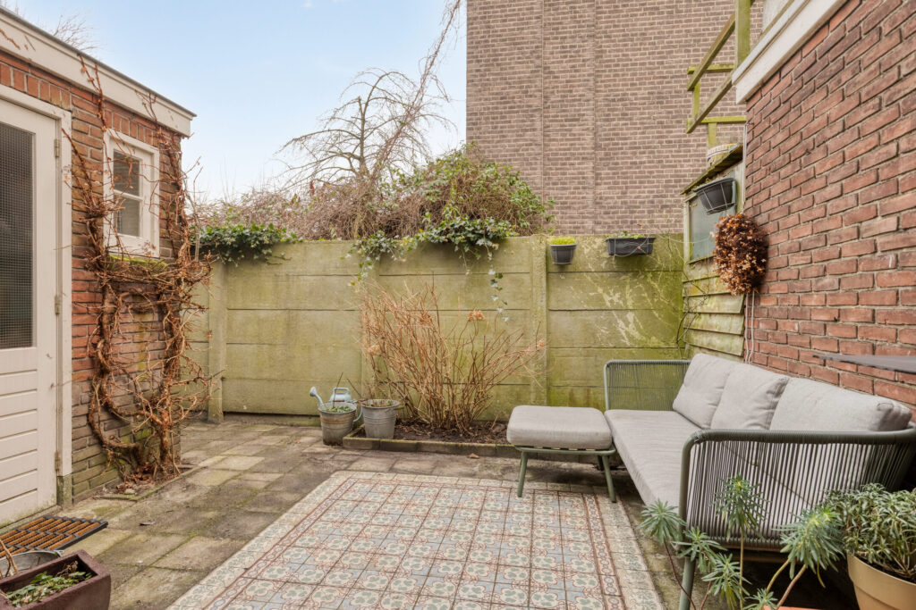 De knusse doch sfeervolle achtertuin, gelegen op het zuidwesten, is aangelegd met sierbestrating met deels kleurrijke tegels en een plantenborder. De achterom is naast de woning gelegen en komt middels een poort uit aan de voorzijde.