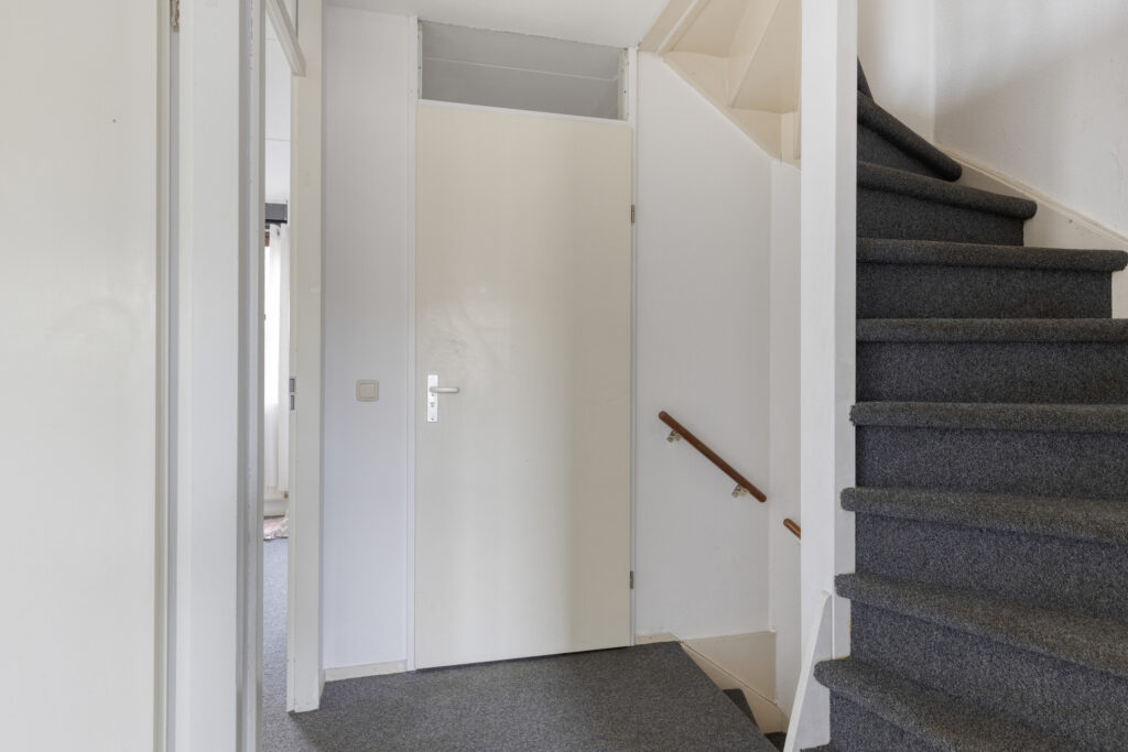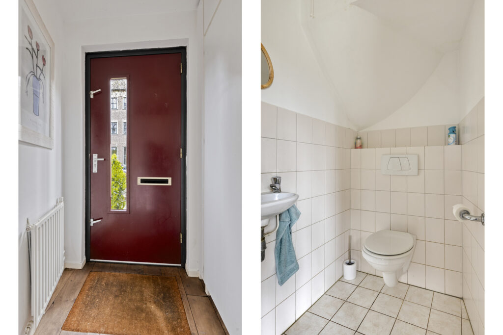 U betreedt de woning via de hal, waar zich de garderobe, de meterkast en een deels betegelde toiletruimte met fonteintje bevinden. Vanuit de hal heeft u toegang tot de woonkamer.