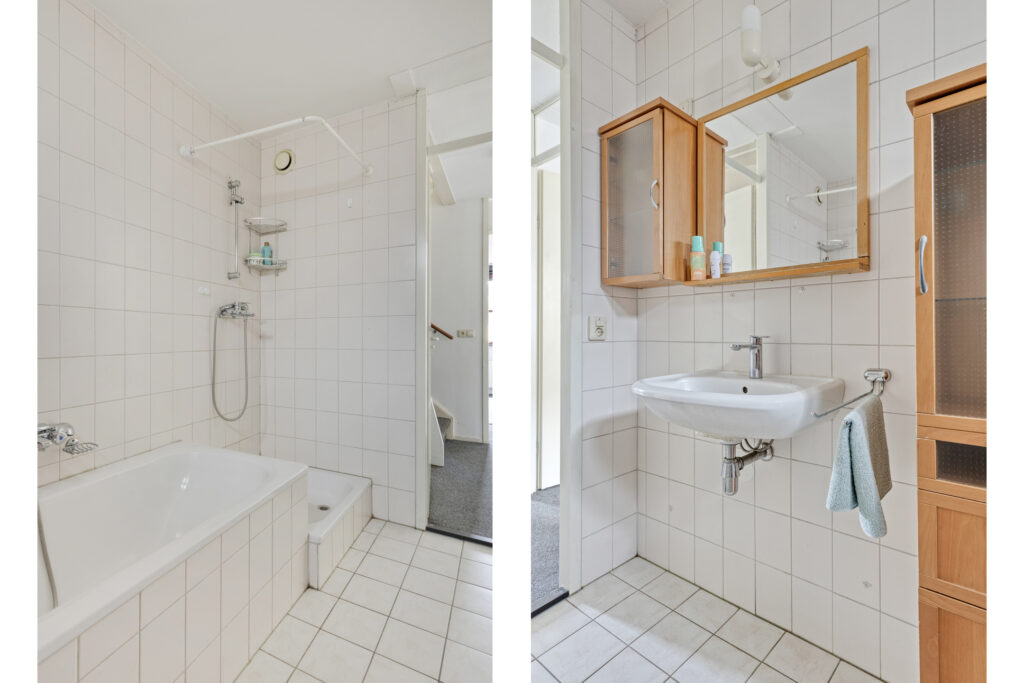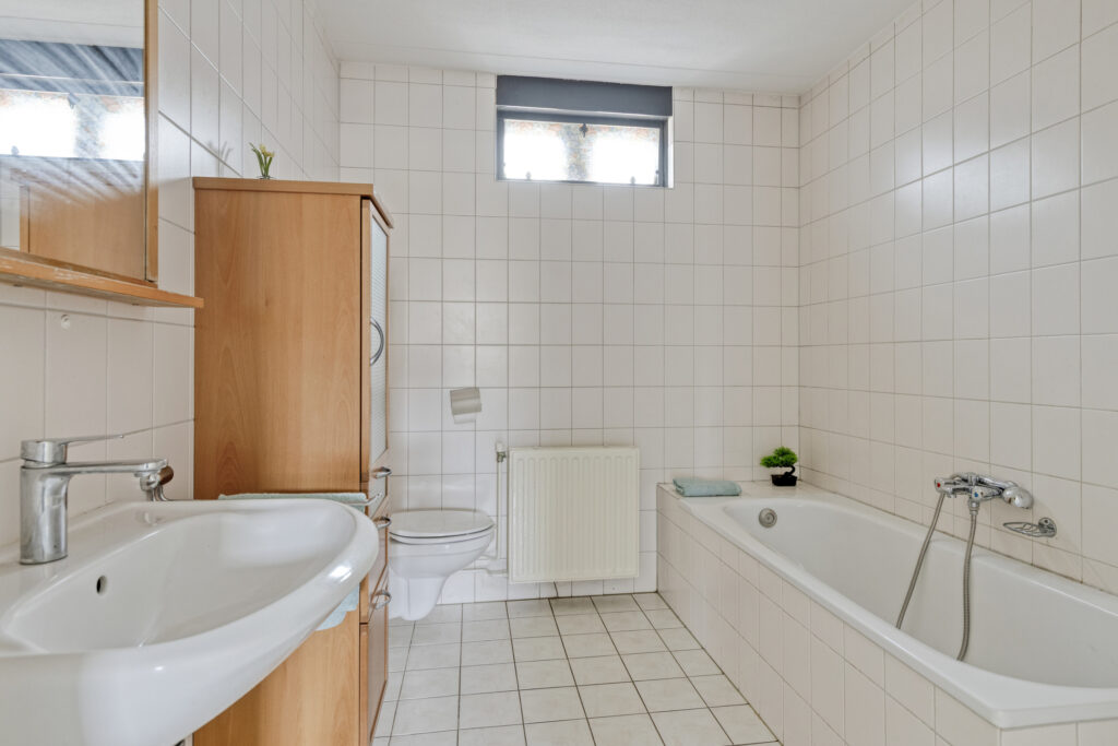 De badkamer is volledig betegeld en beschikt over een douche, ligbad, wastafel en een tweede toilet.