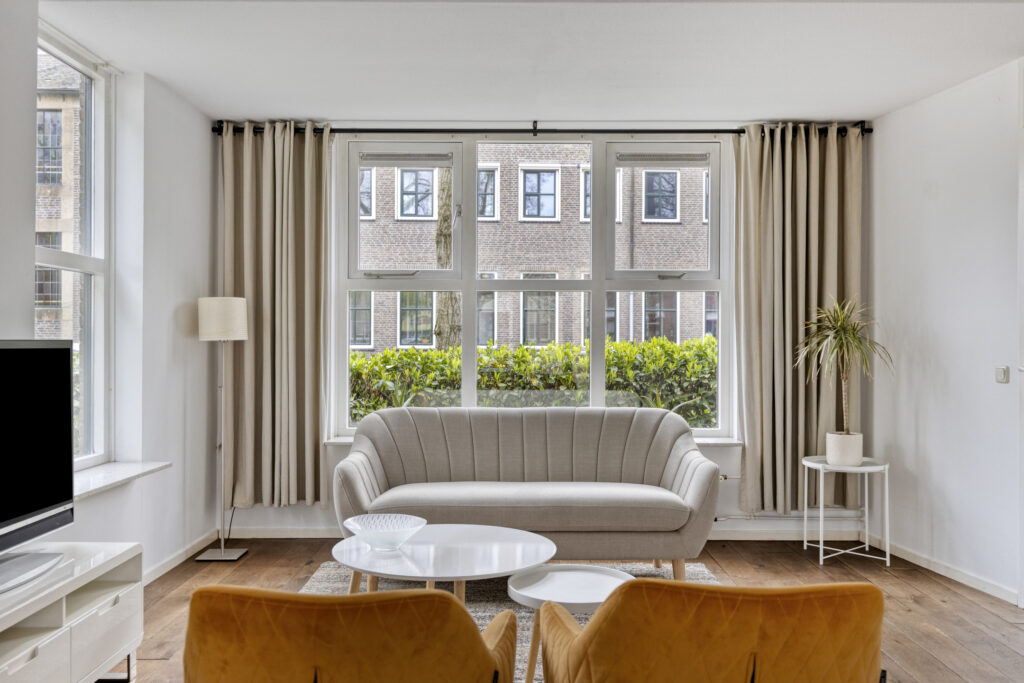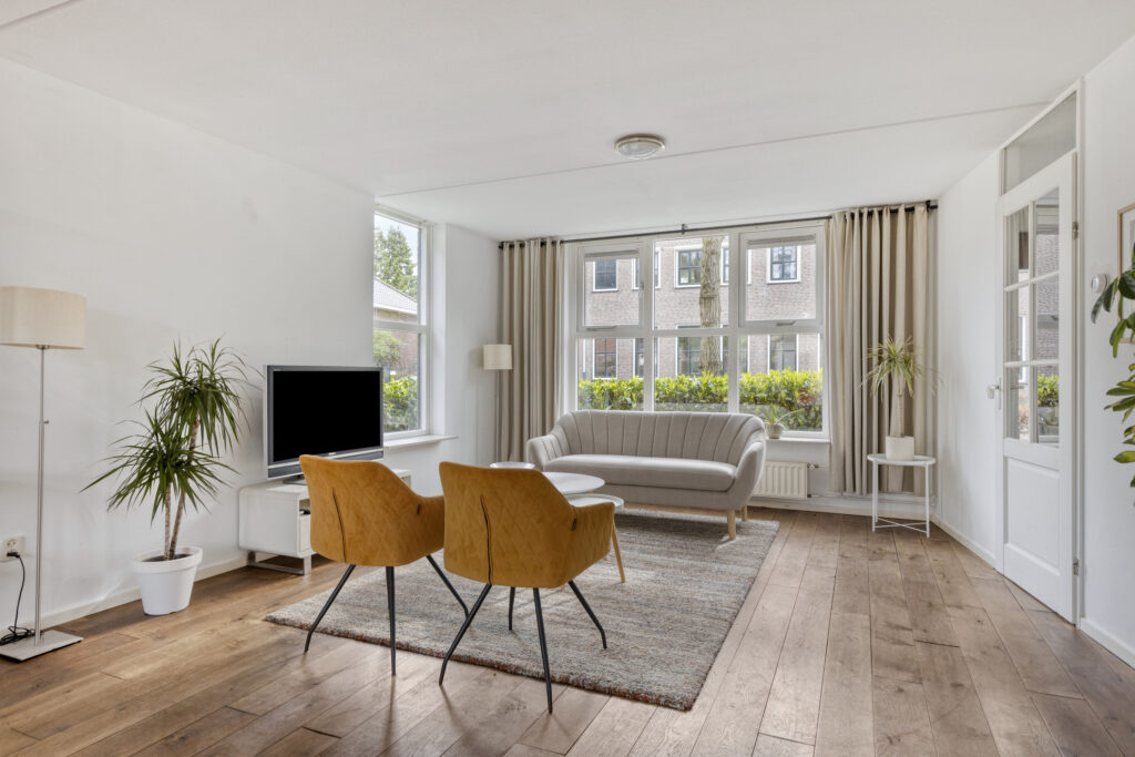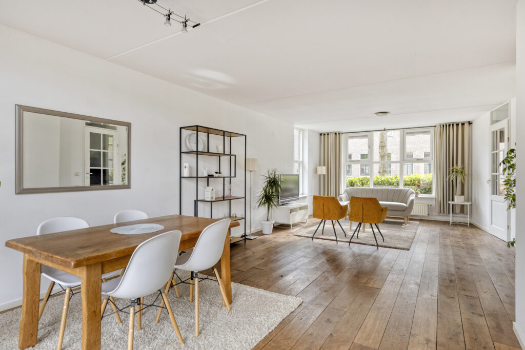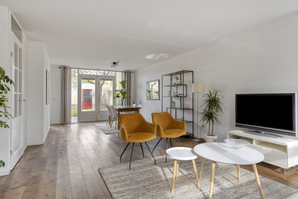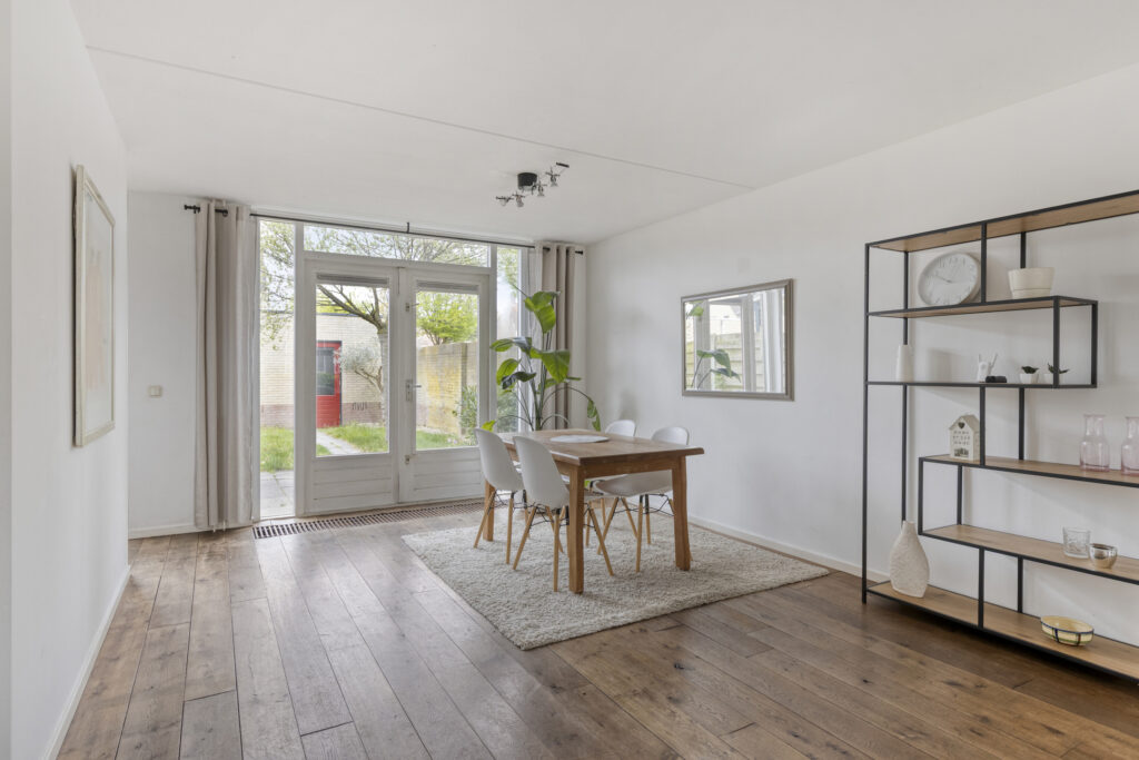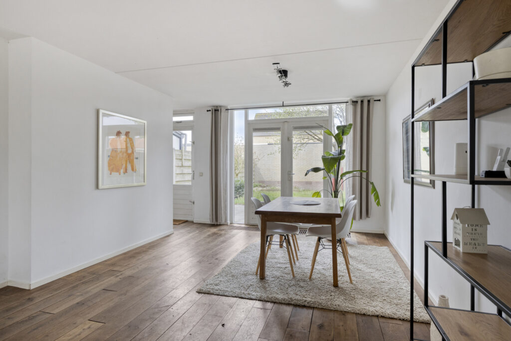 De woonkamer is ruim en profiteert van veel natuurlijke lichtinval dankzij de grote raampartijen aan de voor-, zij- en achterzijde. De ruimte biedt plek voor een fijn zit- en eetgedeelte. Aan de achterzijde kan bijvoorbeeld een gezellige eetkamer worden gerealiseerd. Via de dubbele openslaande deuren loop je zo de tuin in.