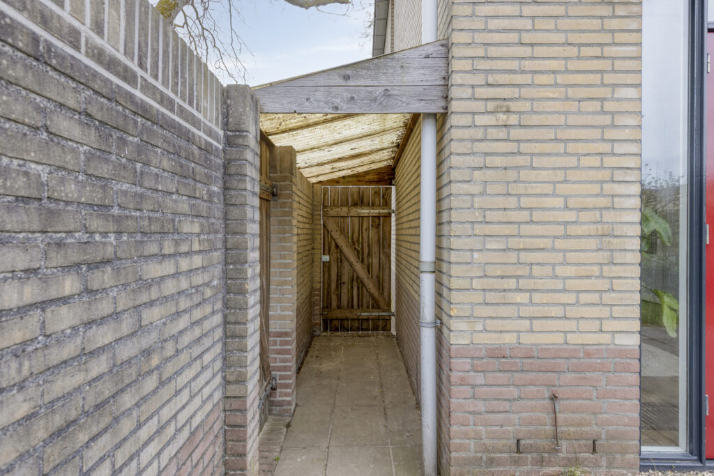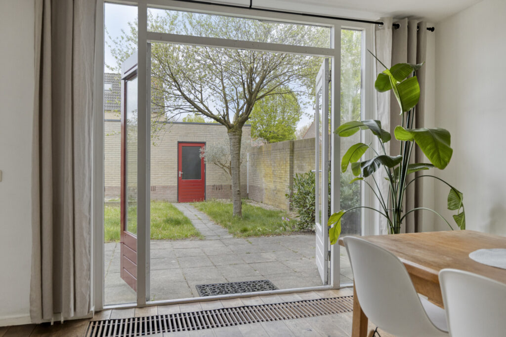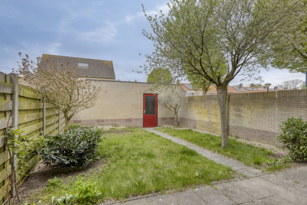 De woning beschikt over een ruime achtertuin met gazon en vaste beplanting. De tuin is praktisch in gebruik dankzij de zij-ingang en de directe toegang tot de garage. Aan de achterzijde van de woning bevindt zich een handbediende luifel, ideaal om op zonnige dagen voor schaduw te zorgen.