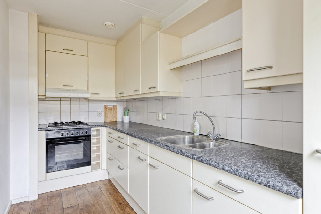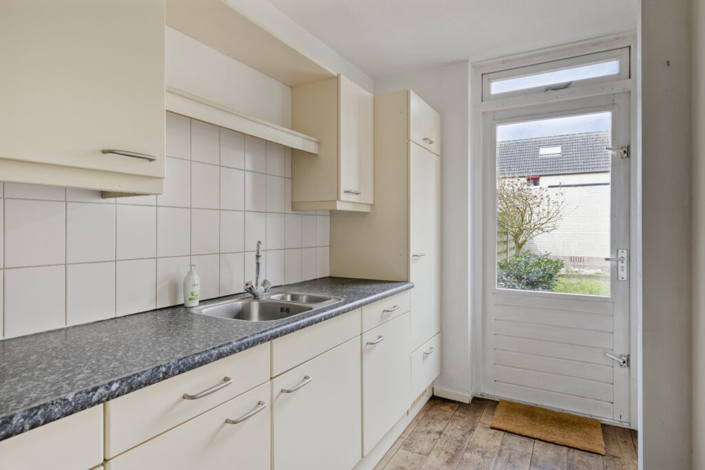 De keuken ligt, net als de eetkamer, aan de achterzijde van de woning en is uitgevoerd in een praktische L-opstelling. De keuken is voorzien van diverse inbouwapparatuur, waaronder een 4-pits gasfornuis, afzuigkap, oven, vaatwasser en een koelkast met vriesvak. Daarnaast is er veel bergruimte en heb je direct toegang tot de achtertuin.