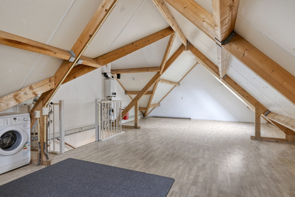 Via een vaste trap bereik je de tweede verdieping. Deze royale zolderverdieping is voorzien van aansluitingen voor wasapparatuur, de cv-ketel en een geplaatst Velux dakraam. Deze verdieping biedt de mogelijkheid tot het realiseren van één of zelfs twee extra slaapkamers.