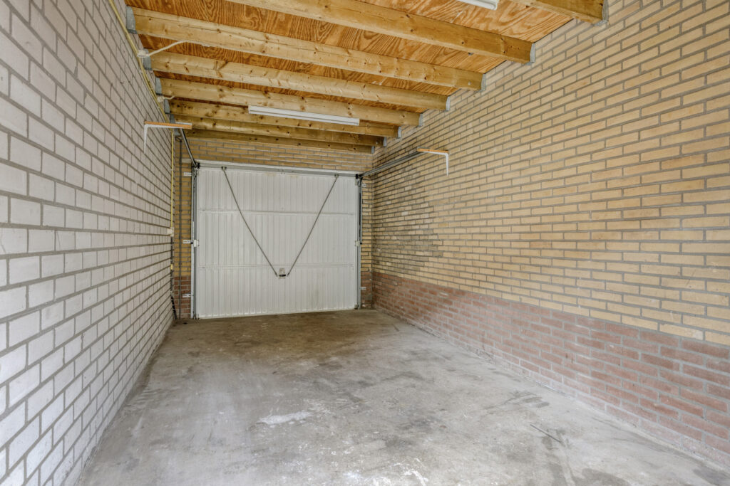 De royale garage met betonvloer biedt volop ruimte voor het stallen van een auto, fietsen of het netjes opbergen van spullen.