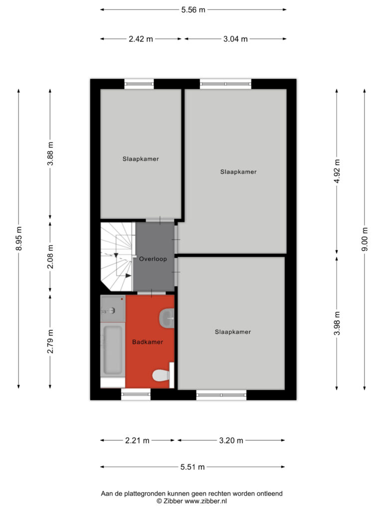 U komt boven op de overloop van de eerste verdieping, vanwaar toegang is tot drie ruime slaapkamers en de badkamer.