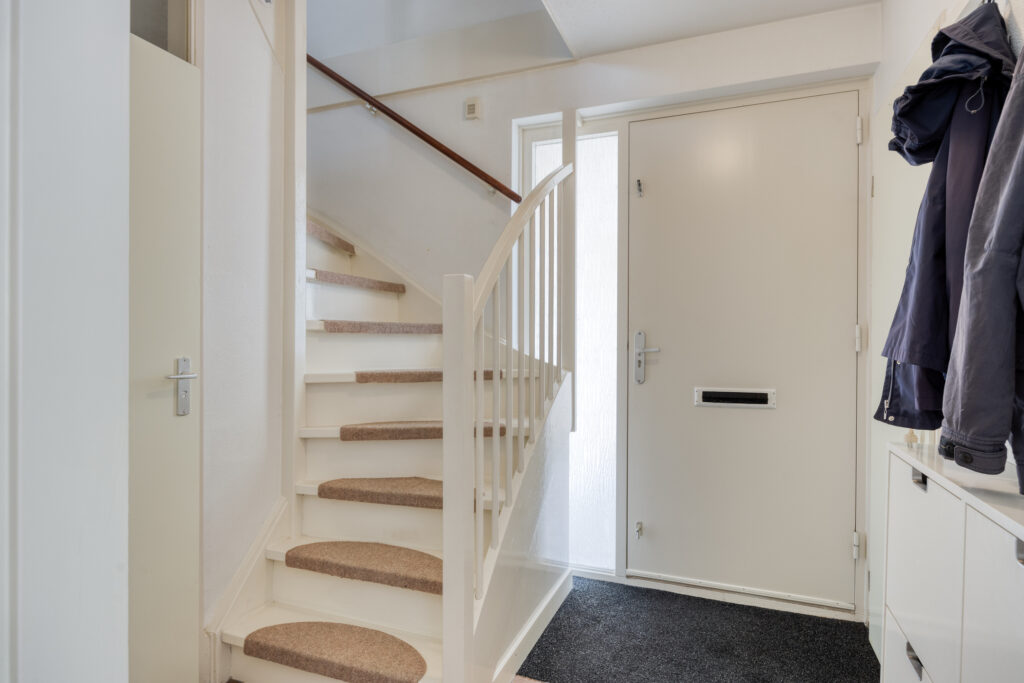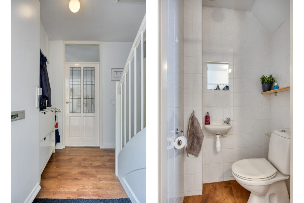 Via de eigen oprit is de overdekte entree te bereiken. In de hal bevinden zich de meterkast en de trapopgang naar de eerste verdieping. Tevens is hier de licht betegelde toiletruimte met een closet en fonteintje gelegen.
