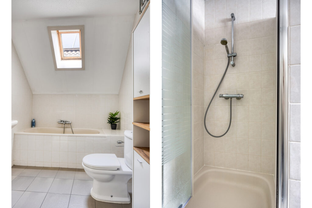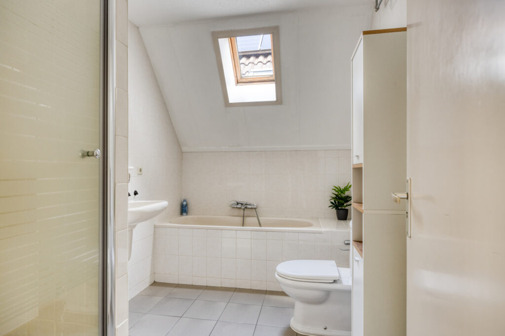 De licht betegelde badkamer is uitgerust met een ligbad met een thermostaatkraan, een douche met een thermostaatkraan, een closet en een wastafel. Het geheel is uitgevoerd met lichte wandbetegeling en een lichtgrijze tegelvloer.
