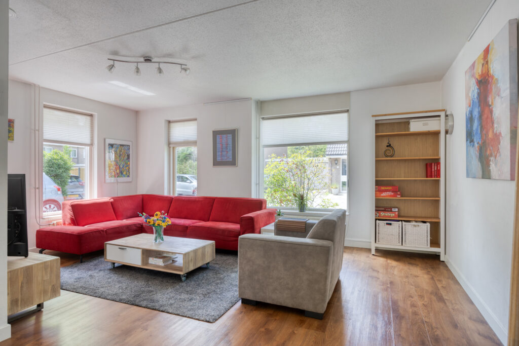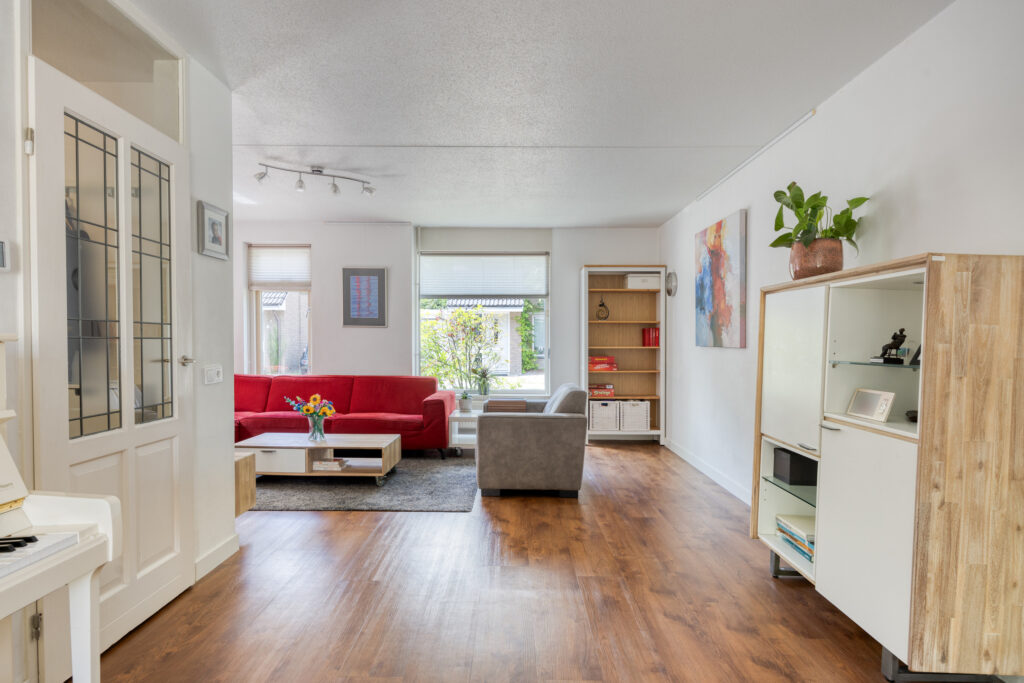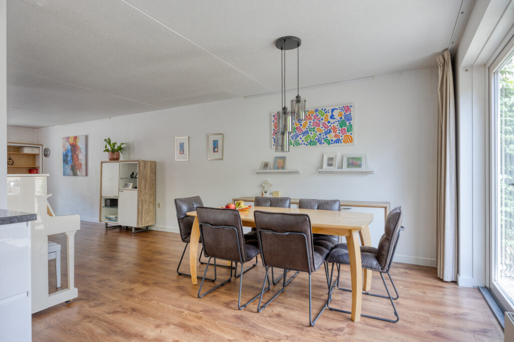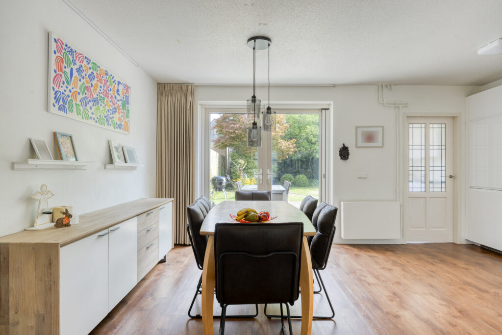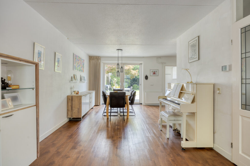 De ruime L-vormige woonkamer is een fijne en lichte ruimte en op de vloer ligt een nette PVC-vloer met een houtlook welke op de gehele begane grond is doorgelegd. Het zitgedeelte is aan de voorzijde gelegen en het eetgedeelte ligt aan de achterzijde. De diverse raampartijen zorgen voor een prettige lichtinval en openslaande deuren bieden toegang tot de achtertuin.