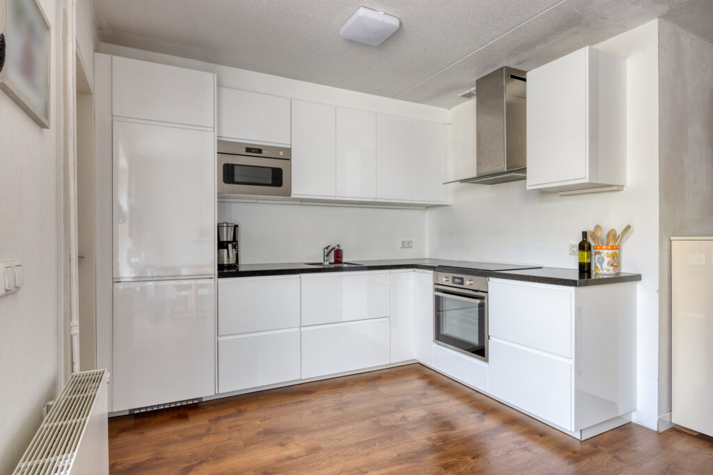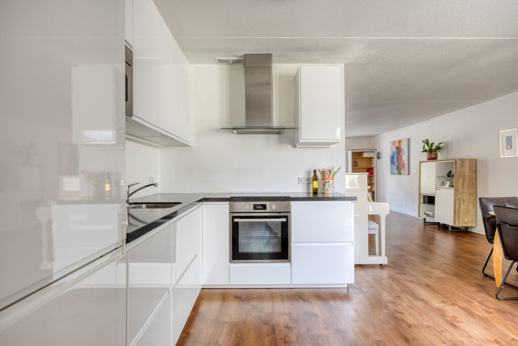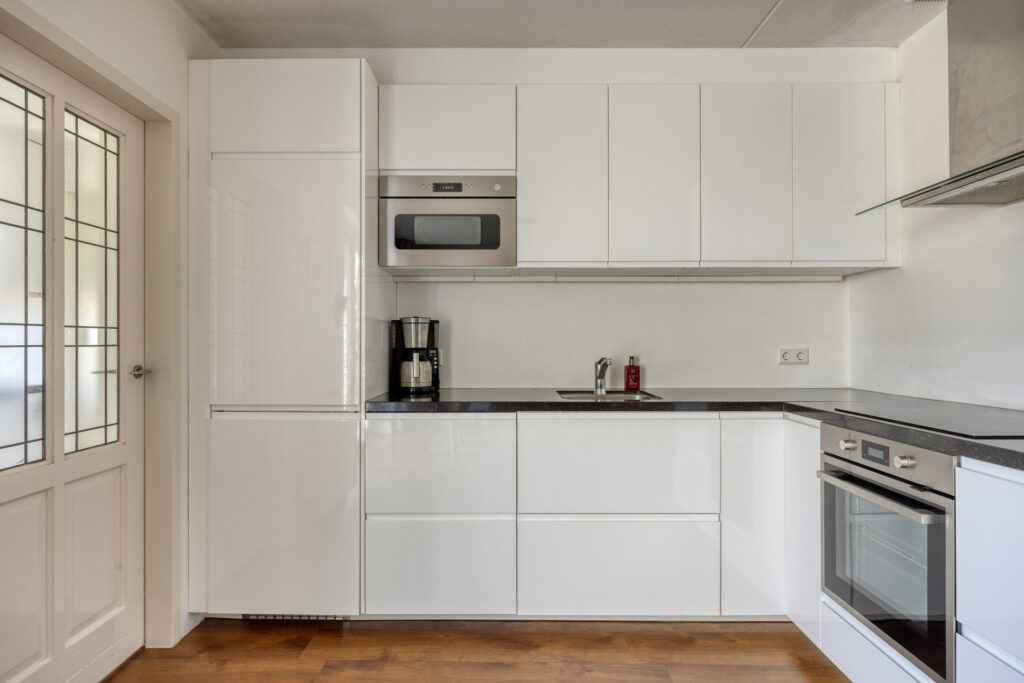 De open keuken is voorzien van een moderne en lichte keukeninrichting met een natuurstenen aanrechtblad, spoelbak, inductiekookplaat, afzuigkap, combi-oven, magnetron, vaatwasser en een grote koelkast. De diverse kasten en lades bieden voldoende bergruimte en aansluitend is een praktische bijkeuken gelegen.