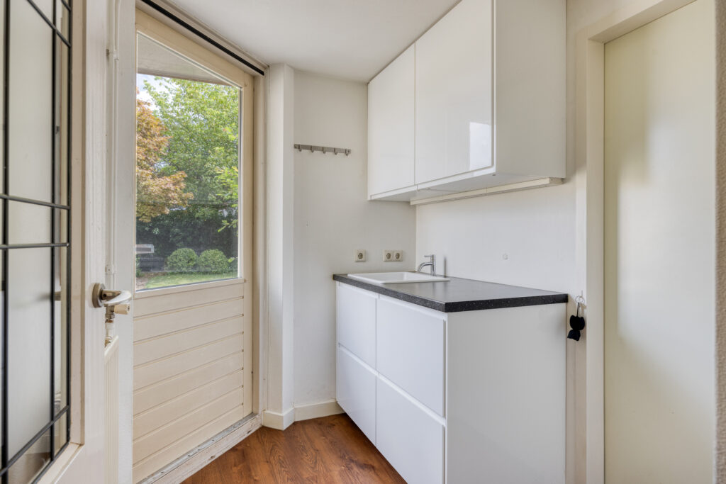 In de bijkeuken staat een extra keukenblok met een spoelbak en vanuit de bijkeuken zijn de garage en de achtertuin te bereiken.